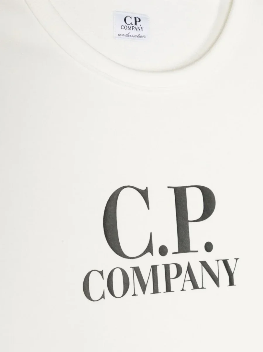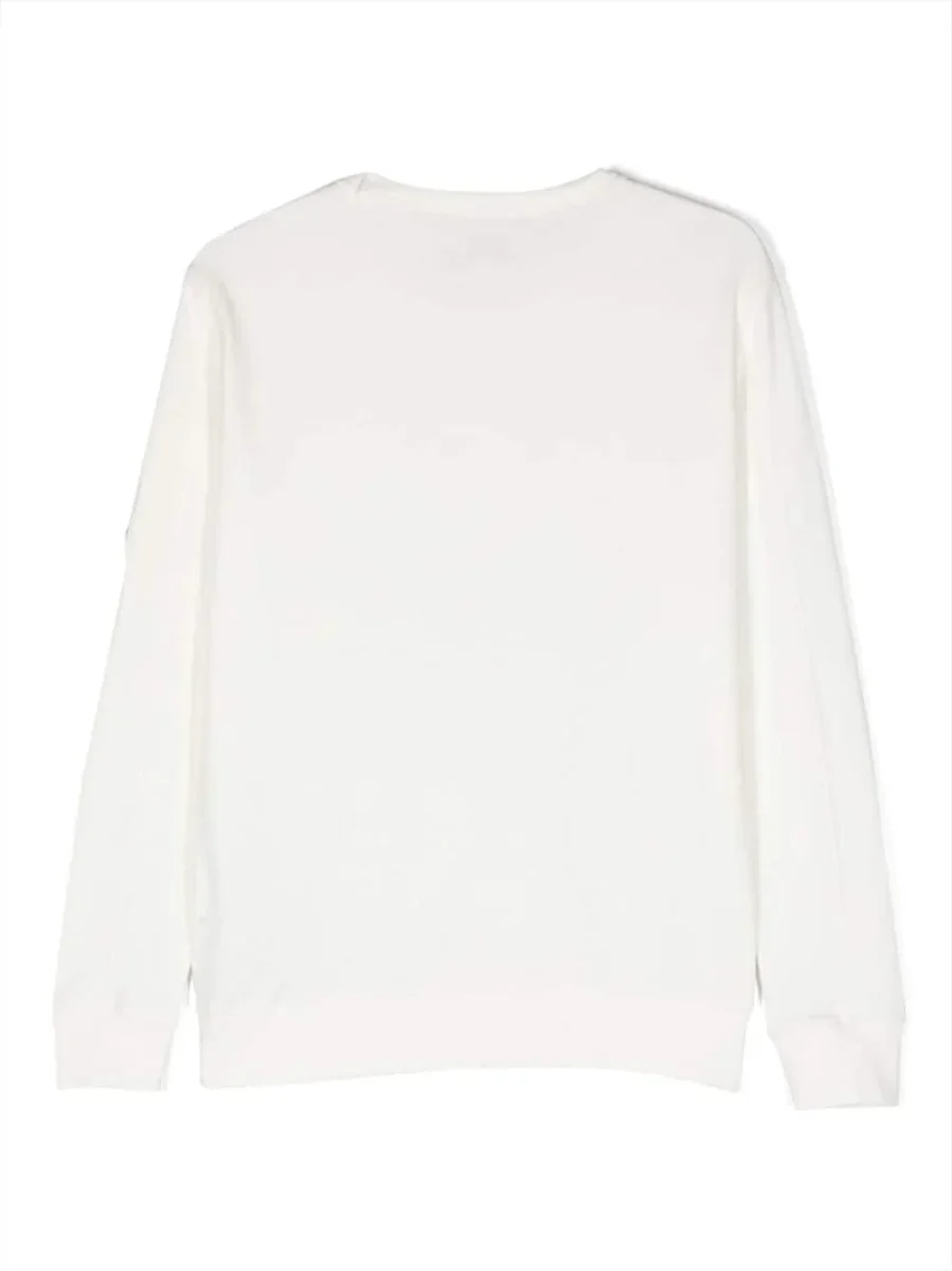Felpa CP Company Kids, modello girocollo senza cappuccio, maniche lunghe, dettaglio con scritta logo al centro e iconico logo applicato sulla manica, colore bianco