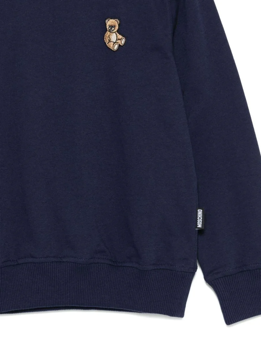 Felpa Moschino Kids, modello girocollo e maniche lunghe, dettaglio con ricamo al petto in contrasto, colore blu