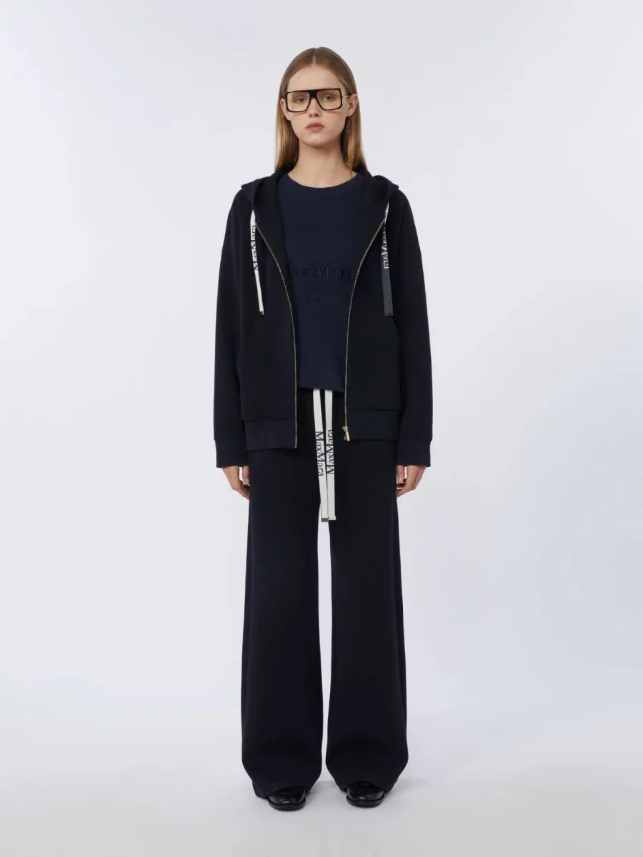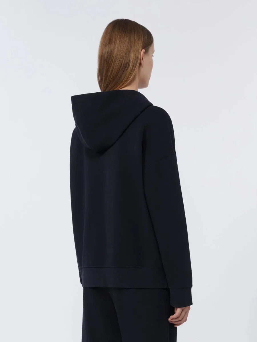 Felpa S Max Mara, modello in jersey di cotone tecnico, modello boxy, maniche lunghe a giro basso, chiusura frontale con zip, tasche a marsupio sul davanti, colore blu
