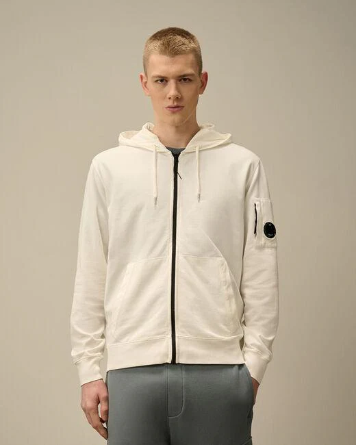 Felpa full zip CP Company, modello full zip con cappuccio, realizzata in fleece di cotone leggere smerigliato, tasca kangaroo, regular fit, colore bianco