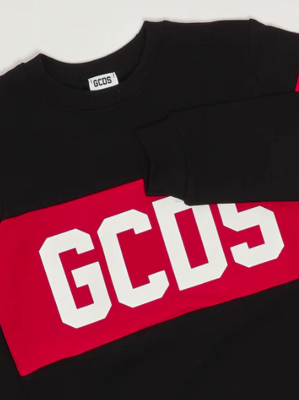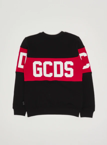 Felpa iconica GCDS bambino, modello girocollo e maniche lunghe dettaglio con banda logata in contrasto al centro, colore nero