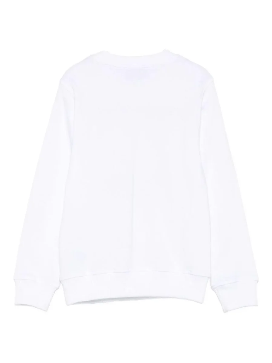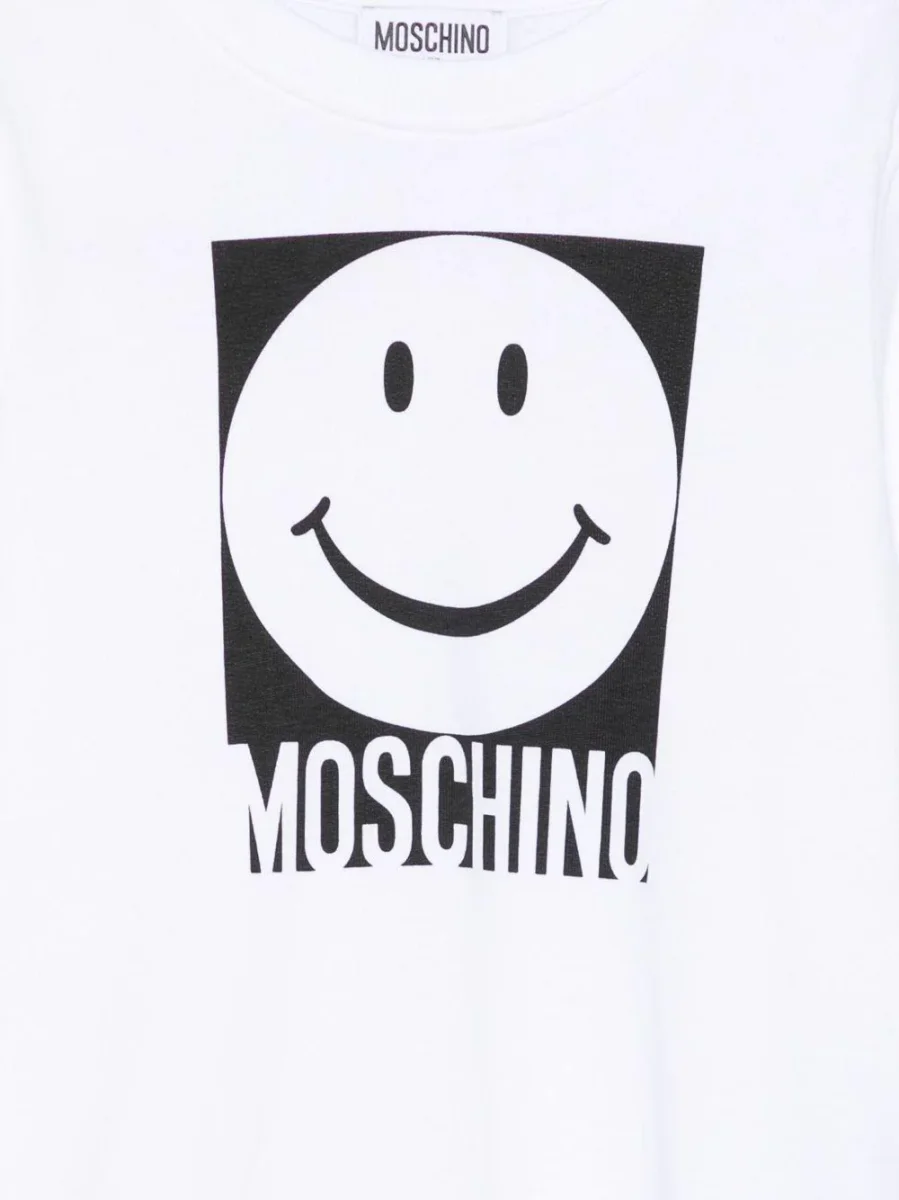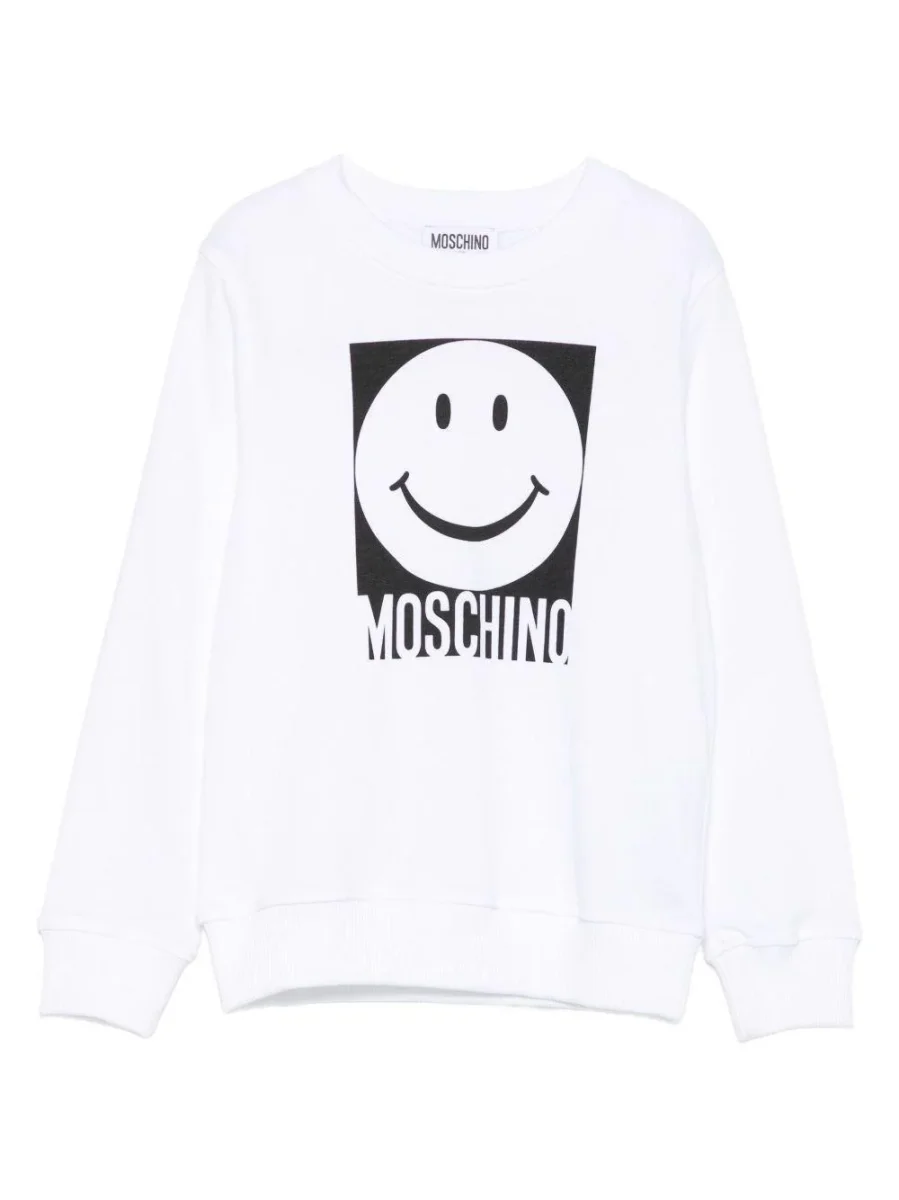 Felpa Moschino Kids, modello girocollo e maniche lunghe, dettaglio con stampa logo smile in contrasto al centro, colore bianco