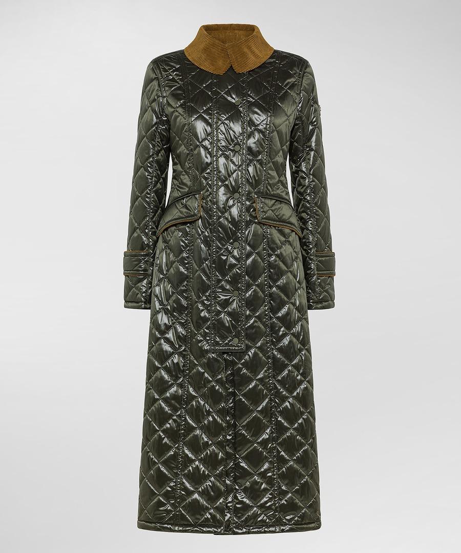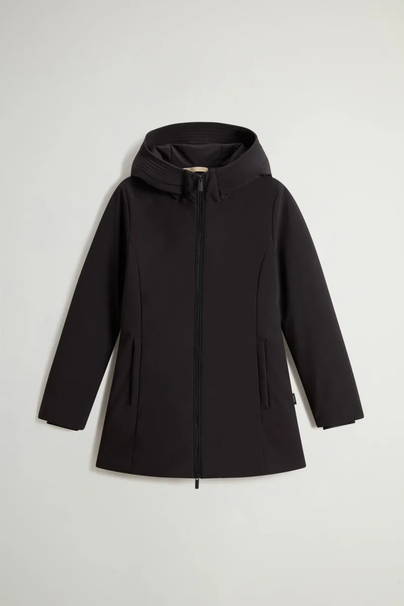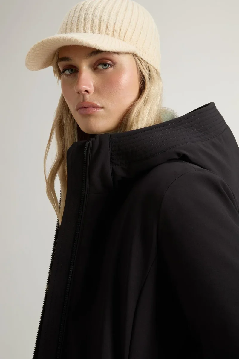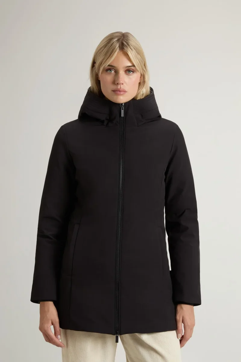 Firth Parka unisce l’eleganza della tradizione Woolrich a un tocco di femminilità , grazie alla silhouette slanciata valorizzata dalla coulisse interna regolabile in vita. Realizzato in Tech Softshell, un tessuto resistente all’acqua e antivento, è imbottito in piuma d’anatra con una trapuntatura Chevron all’interno. È dotato di cappuccio e collo alto per una protezione ottimale, presenta tasche a filetto, una comoda tasca interna con zip, polsini a costine e un’etichetta applicata lateralmente