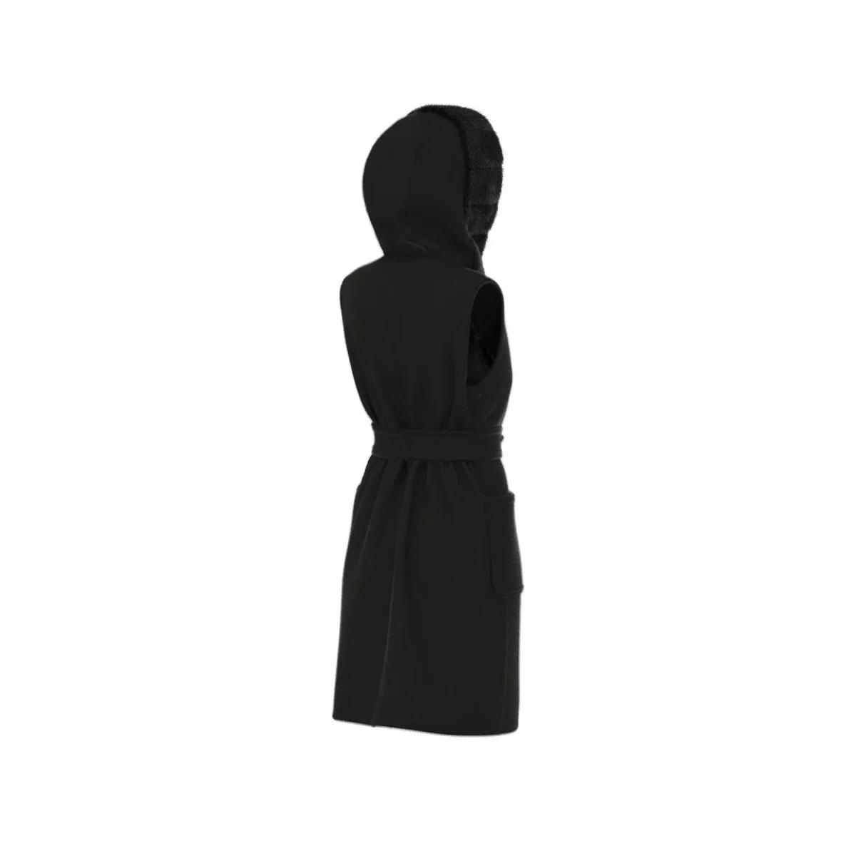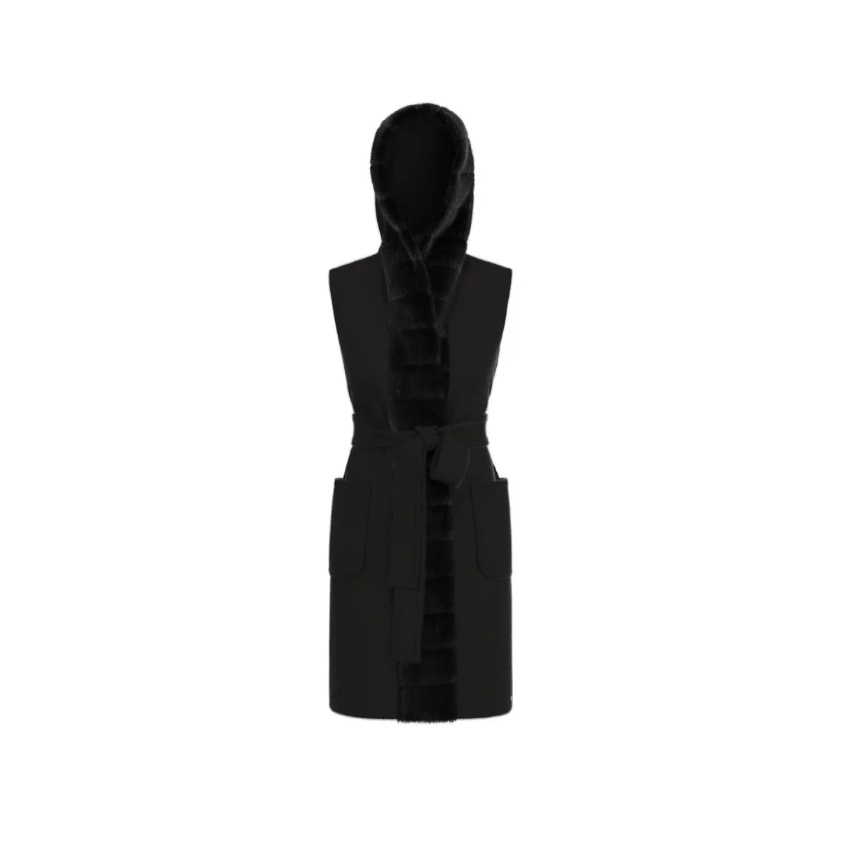 Gilet Emme Marella modello in tessuto tecnico con dettagli furry, fit dritto, scollo a scialle, chiusura monopetto con cintura, tasche laterali applicate, apertura e cappuccio, colore nero