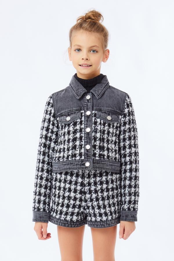 Giubbino Liu jo Junior, modello con collo a camicia, fantasia pied de poule in contrasto all over, vestibilità leggermente cropped, colore grigio