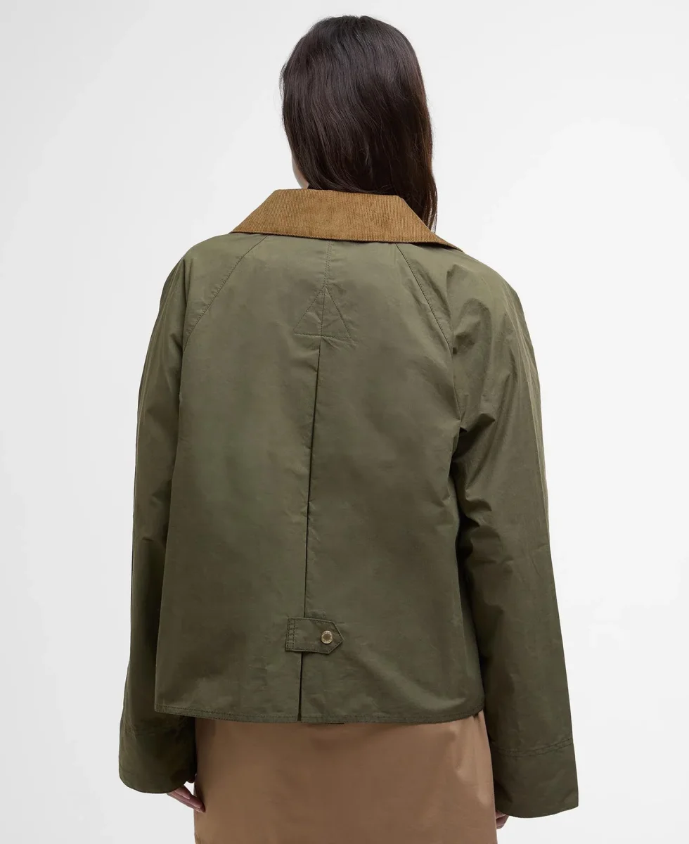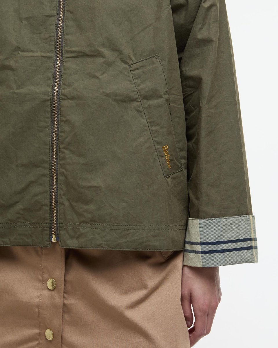 Giacca antipioggia Catlin donna, modello realxed fiti corto, silhouette svasata, fodera in tartan all’interno dei polsini, profonda piega a cannoncino invertita sul retro e iconica zip col tiretto in versione oversize, colore verde