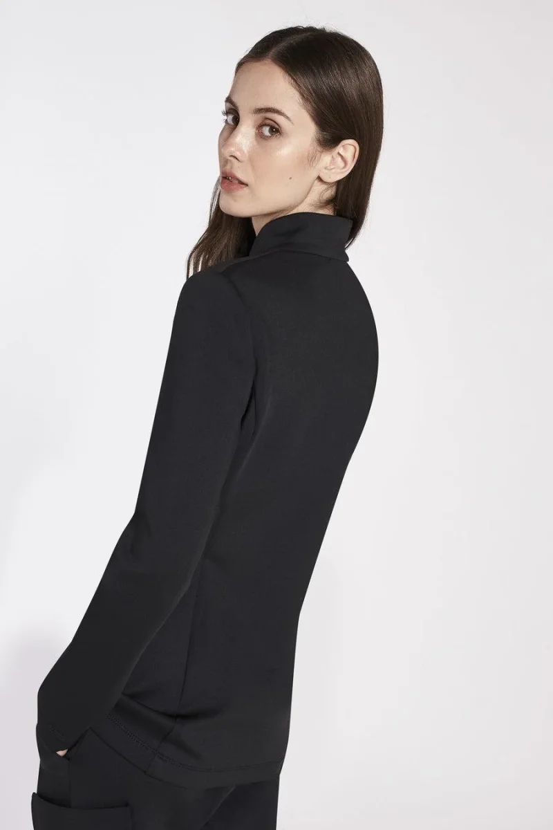 Giacca sfoderata in jersey elasticizzato, collo alla coreana, allacciatura asimmetrica, chiusura con bottoni in madreperla, patte applicate effetto tasca, colore nero