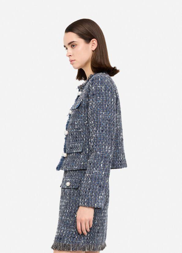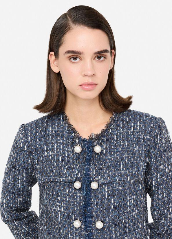 Giacca boucle misto cotone e lana, polsi con spacchetto, taschini e tasche con patta, bordi sfrangiati e perle applicate, chiusura monopetto, colore blu