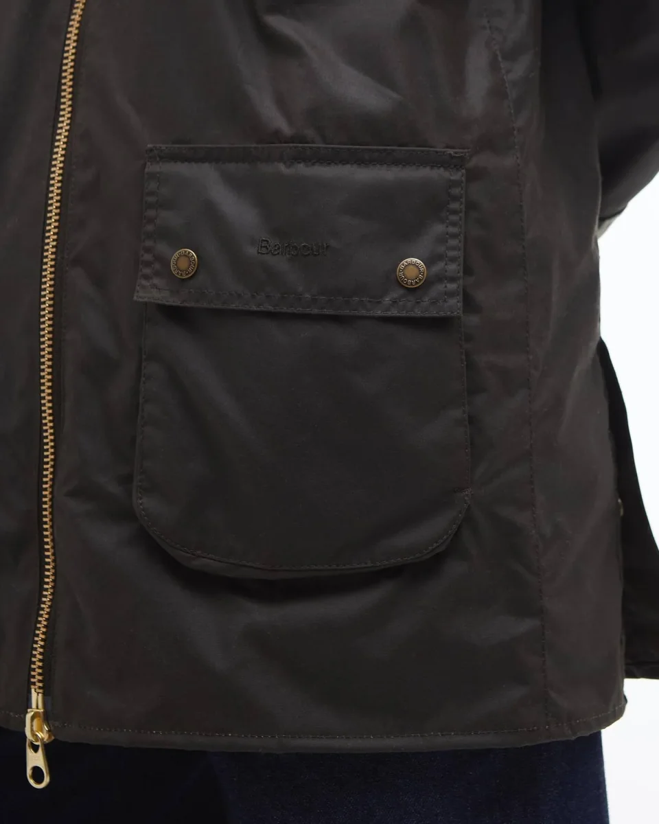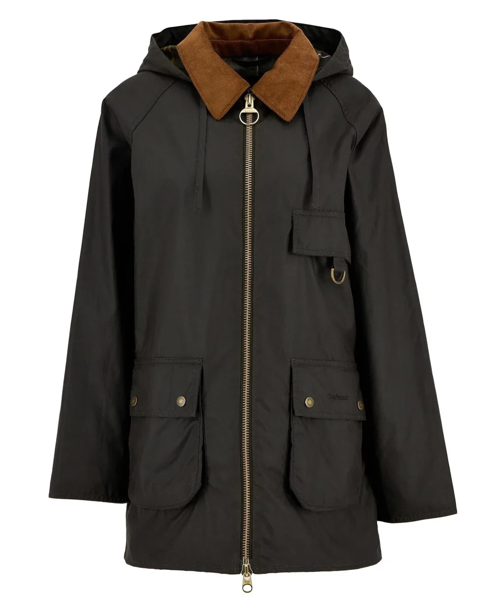 Giacca cerata Highclere wax, lunghezza media, cappuccio rimovibile e colletto in velluto a coste, tradizionali trasche a soffietto, tasche sul petto ad anello a D, chiusura con zip a due vie, colore verde