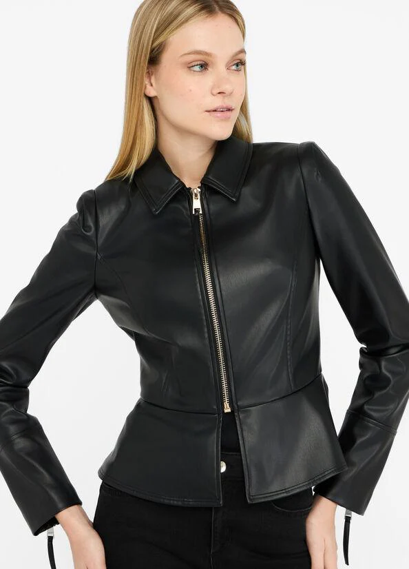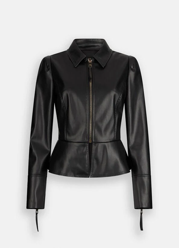 Giacca realizzata in tessuto spalmato, vestibilità slim, collo a camicia, polsi con zip, logo sul retro, chiusura con zip, colore nero