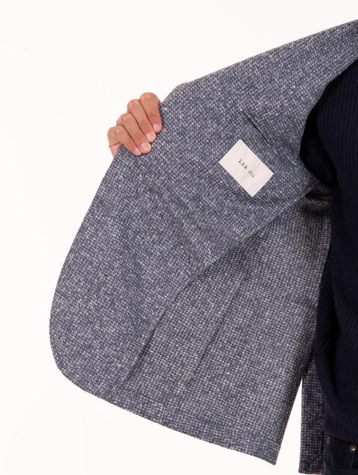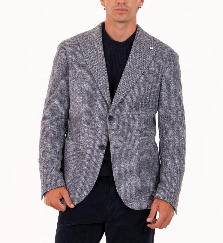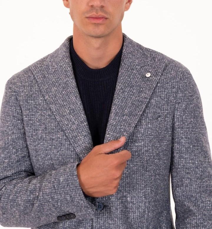 Giacca monopetto Luigi Bianchi Mantova, realizzata in jersey di cotone e lana vergine, fantasia grisaglia, rever a lancia, tasche a toppa frontali, e taschino sul petto, chiusura due bottoni madreperla, colore blu