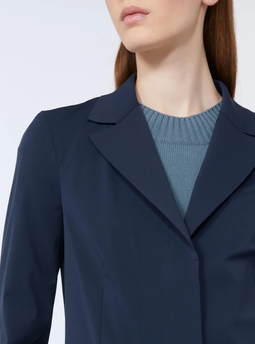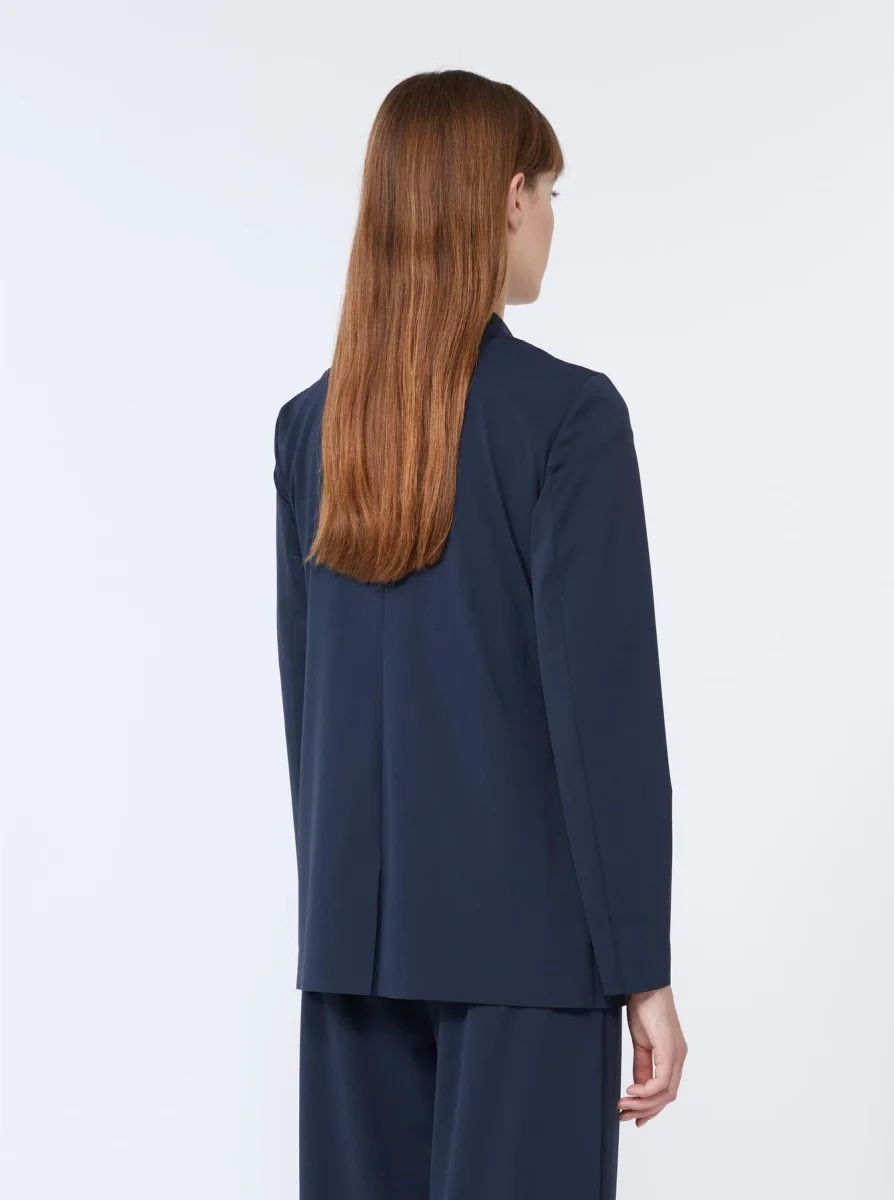 Giacca in jersey tecnico MM Max Mara, modello linea sfiancata, collo con rever, maniche lunghe, chiusura nascosta sul davanti, colore blu