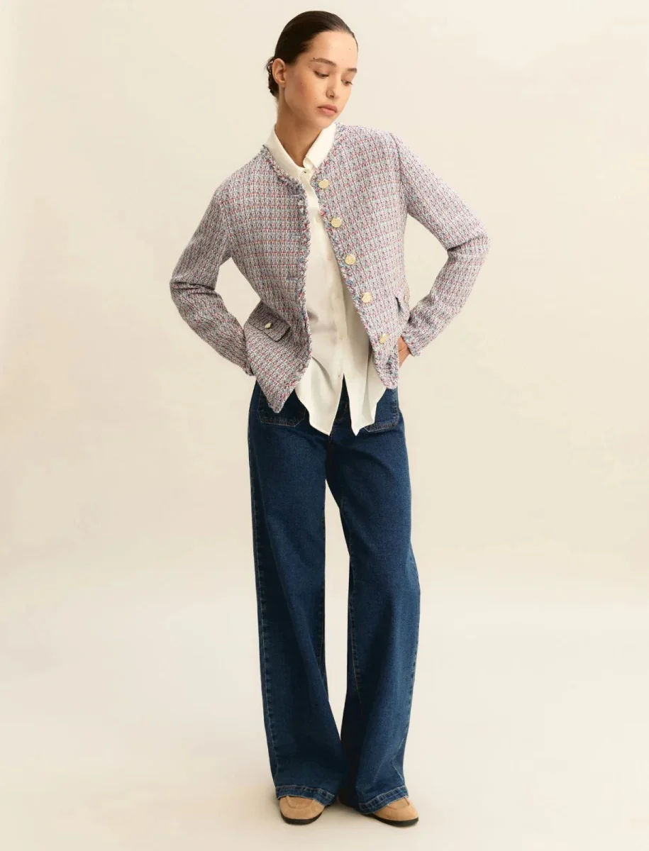 Giacca in stuoia Emme Marella, fit regolare, scollo rotondo e chiusura con bottoni, tasche laterali con patta e bottone, bordi e scollo bordati in tessuto