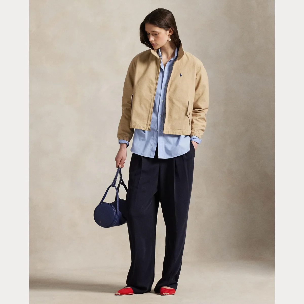 Giacca in tela di cotone Ralph Lauren, completamente foderata, colletto rialzato con bottoni e logo in contrasto sul petto in contrasto, colore beige