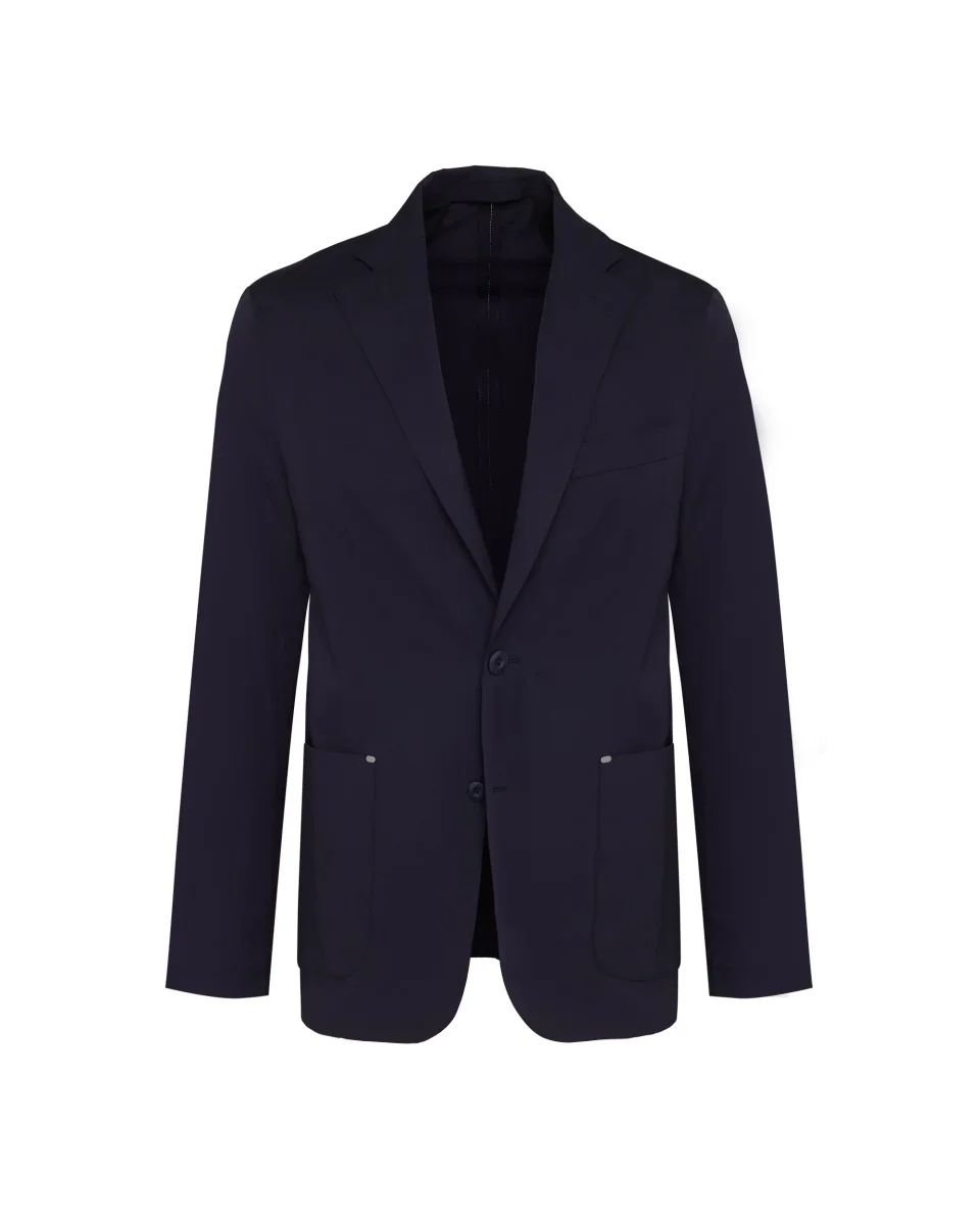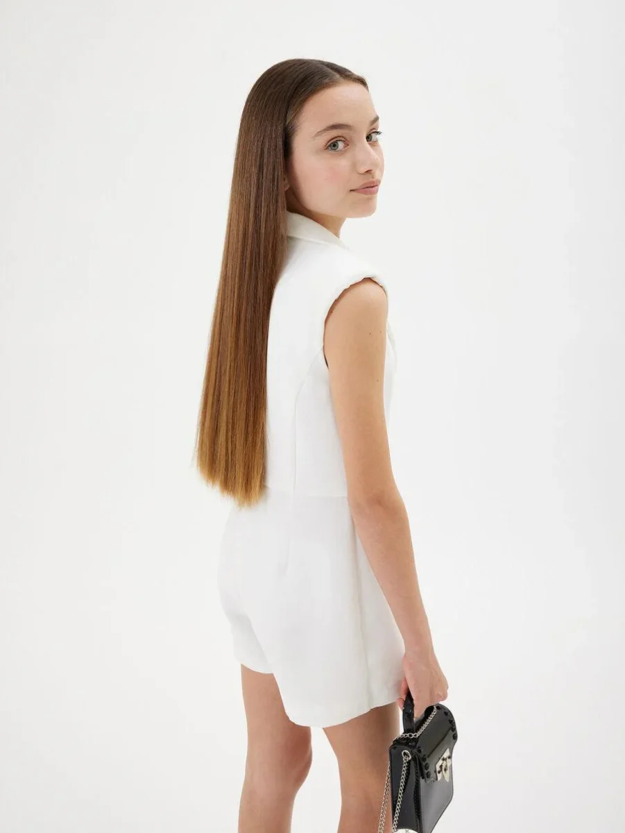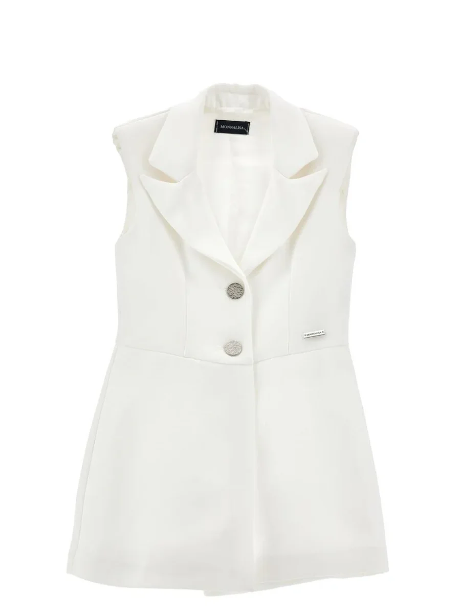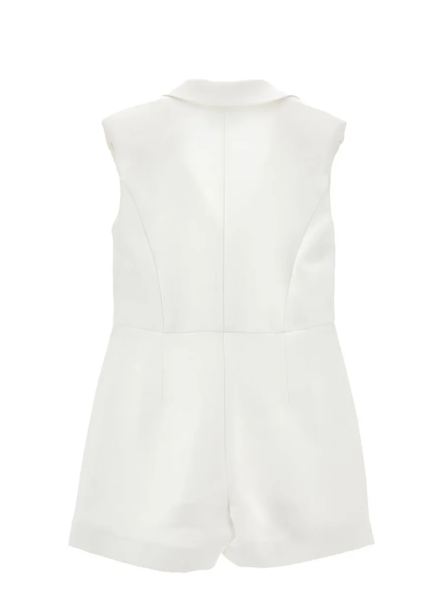 Giacca design a tuta con colletto a revers, allacciatura con bottoni metallici logati, shorts con zip, colore bianco
