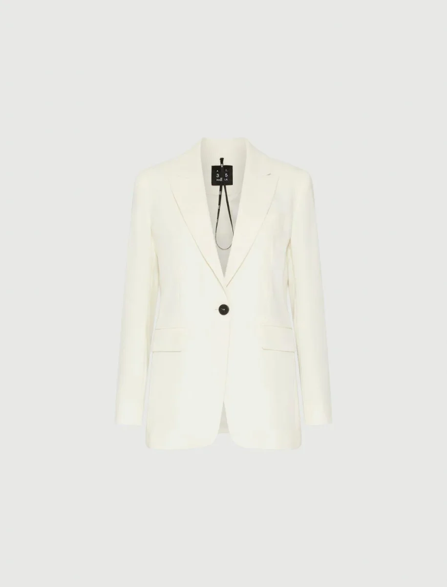 Giacca in crepe envers con fodera interna, fit regolare, collo con rever e taschino al petto, chiusura monopetto con bottone, tasche laterali con patta e spacco centrale posteriori, colore bianco