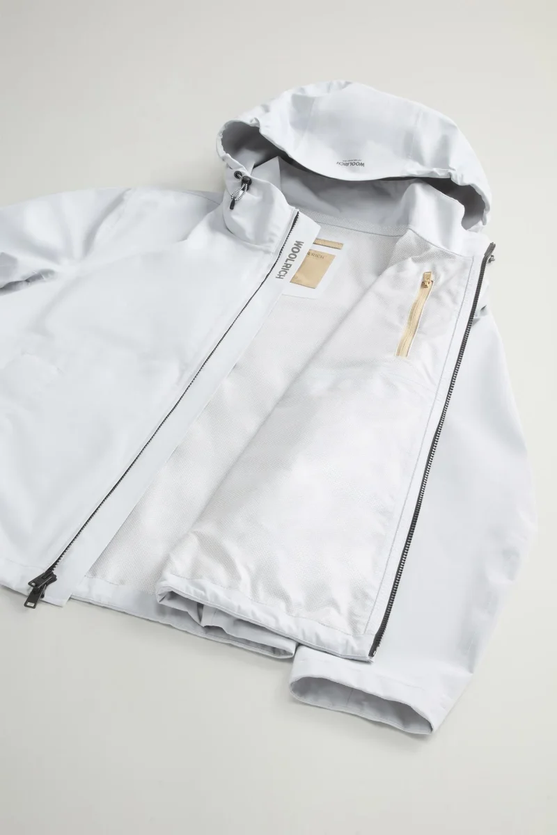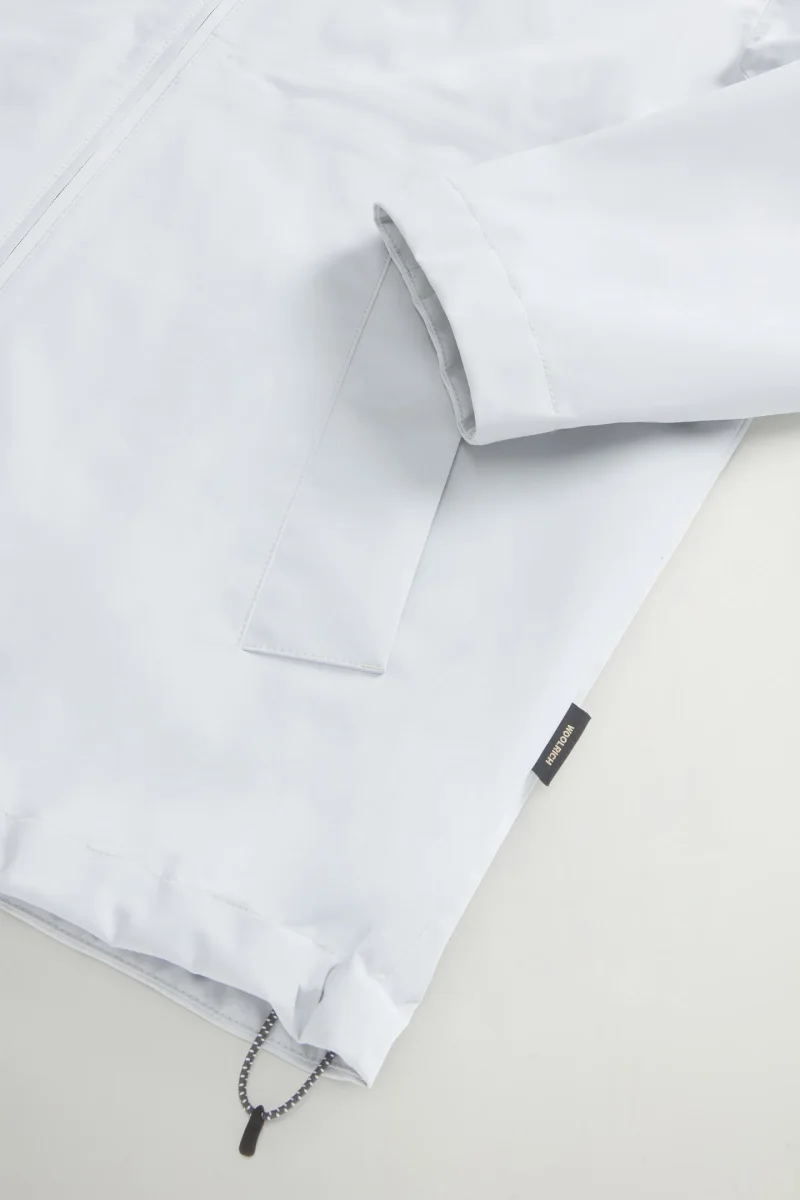 Giubbino Woolrich realizzato in tessuto a due strati, resistente all’acqua, traspirante, cuciture nastrate, cappuccio regolabile, tasche e chiusura con zip, colore ghiaccio