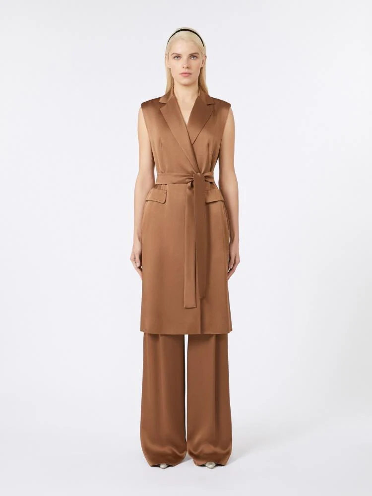 Giacca in envers satin Max Mara linea Studio, profondo collo a rever, chiusura doppiopetto con due bottoni, tasche a filetto verticale con patta applicata, colore marrone