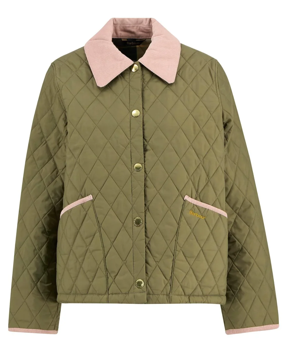 Giubbino Liddesdale Cropped Icons, collezione Barbour Icons, trapuntatura a rombi, con finiture in velluto a coste sottili, colore verde con contrasti rosa