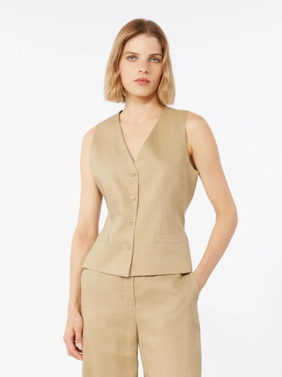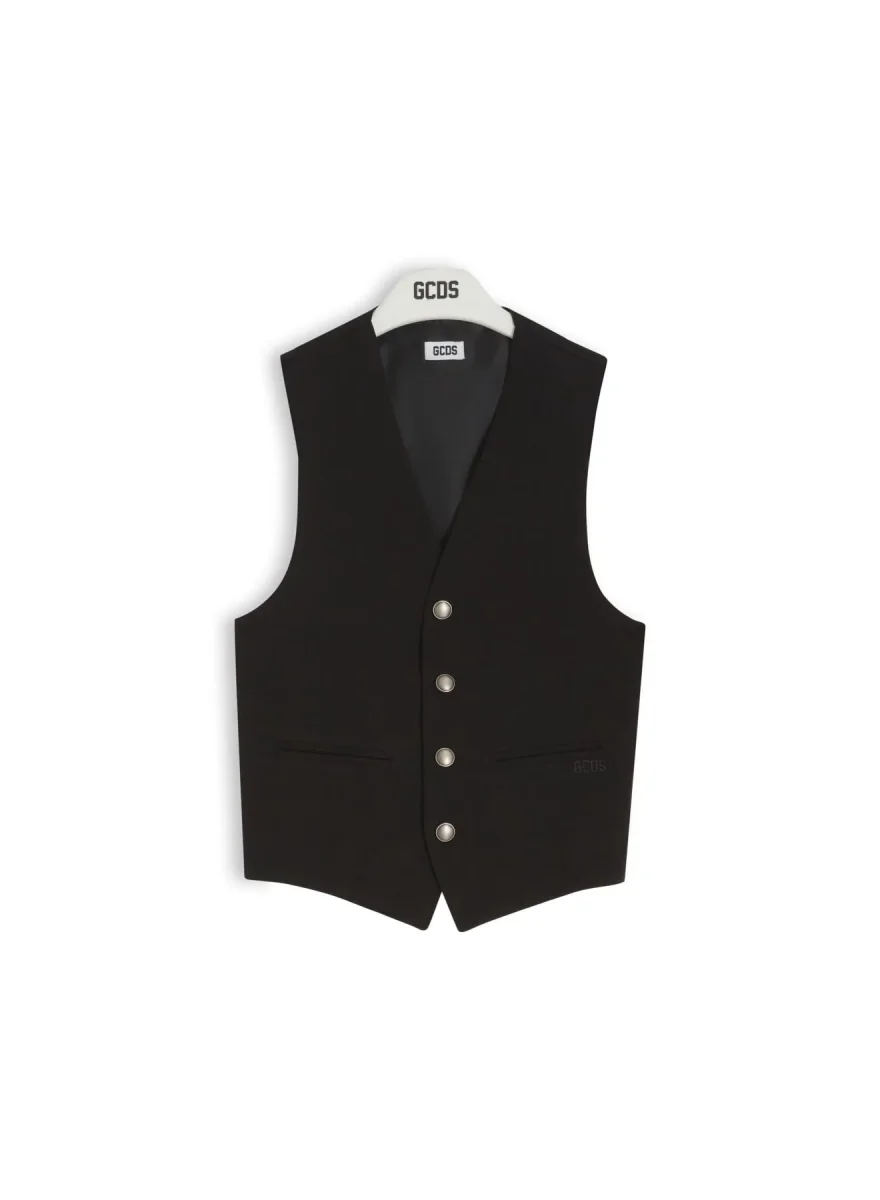 Gilet Twinset Actitude, modello in cady con bottoni ricoperti in raso e logo in metallo, scollo halter e chiusura sul retro del collo, rever e dettagli in raso, tasche con patta, linea fitted, colore nero
