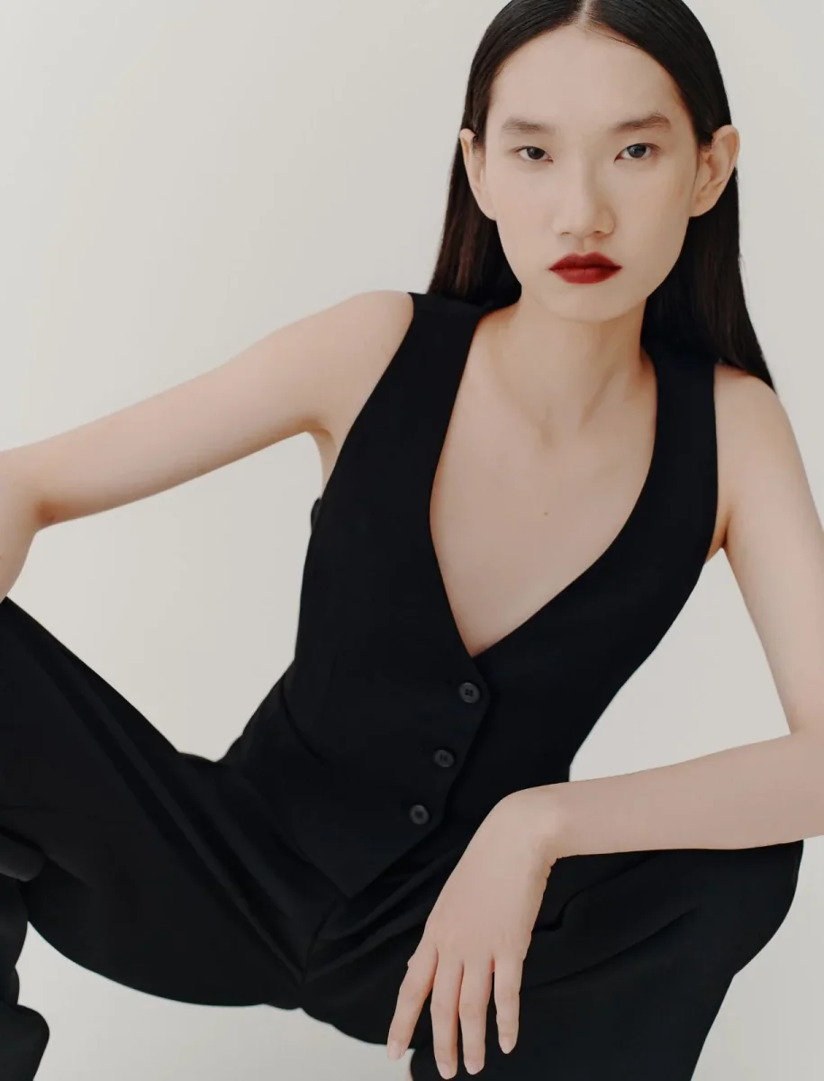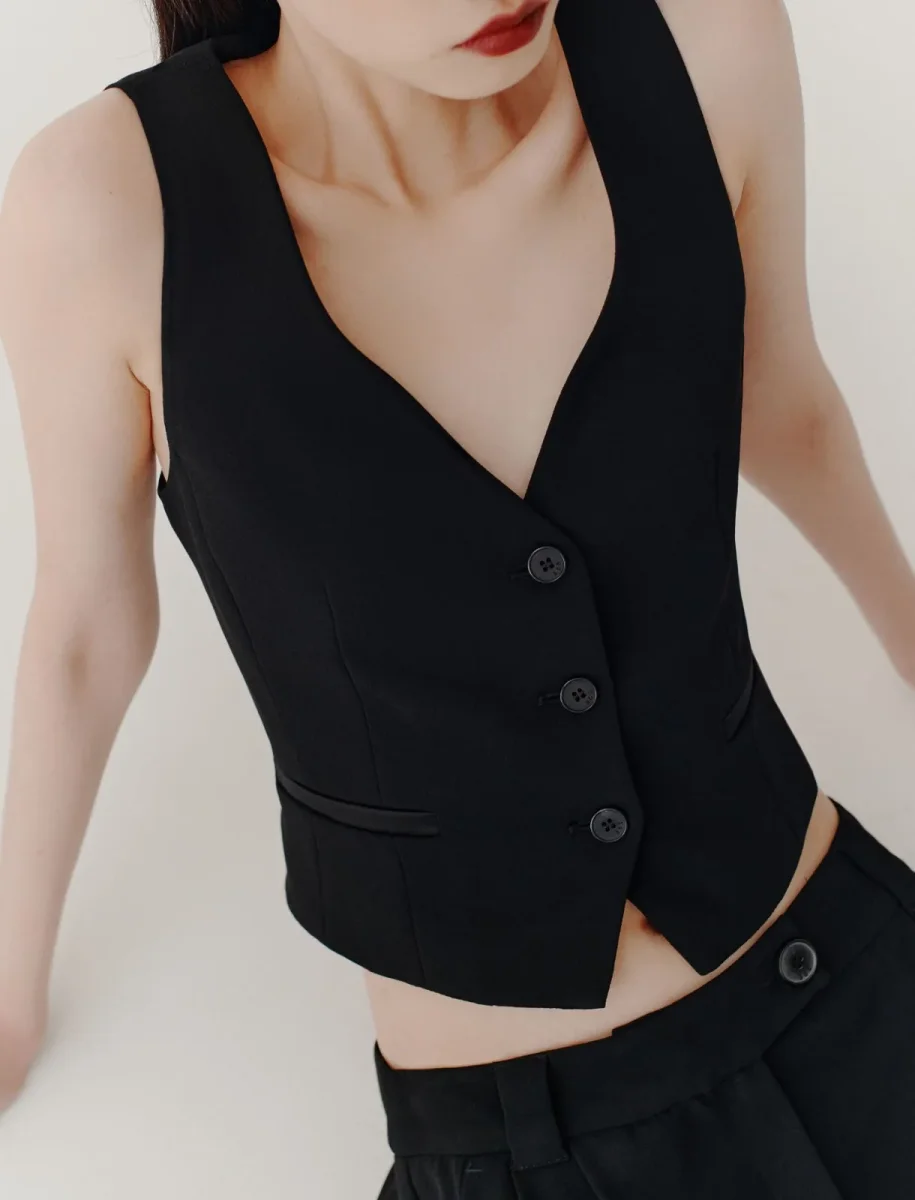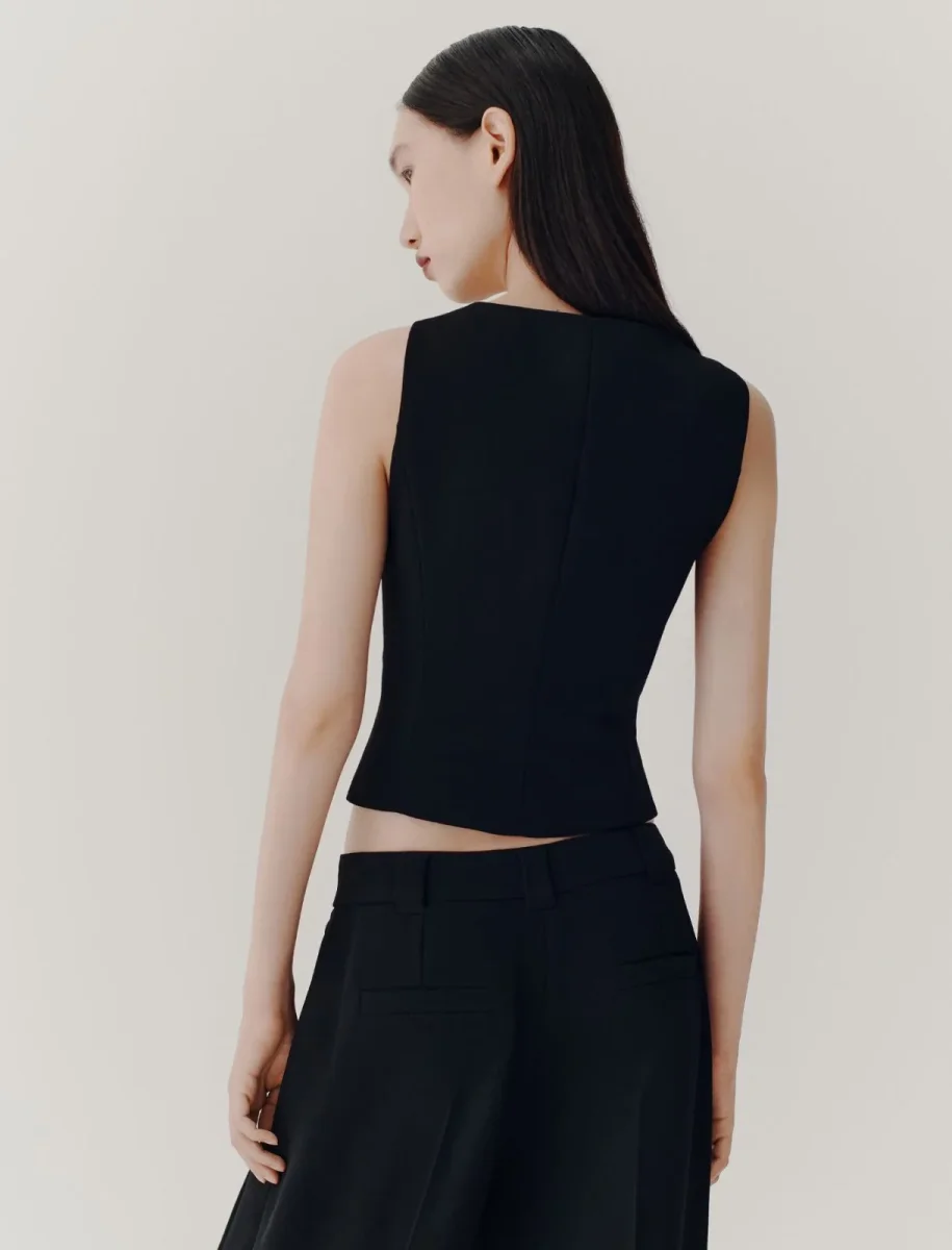 Gilet in envers satin Marella, fit aderente, scollo a V con bottoni a vista, tasche laterali con filetto, pince e fianchi sagomati, colore nero