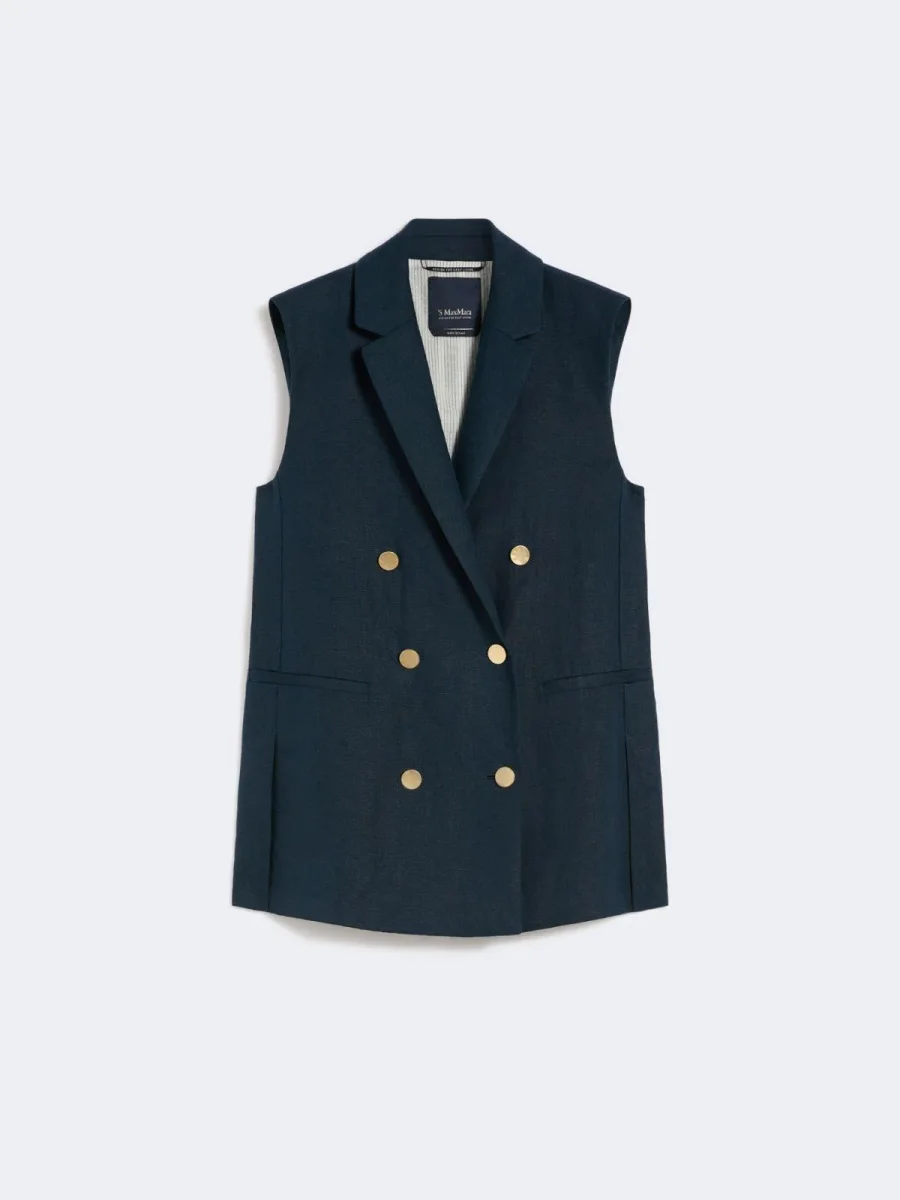 Gilet in stuoia di lino S Max Mara, modello doppiopetto, linea dritta, collo a rever, chiusura con bottoni in metallo, tasche a filetto orizzontale, spacchi laterali sui fianchi, colore blu