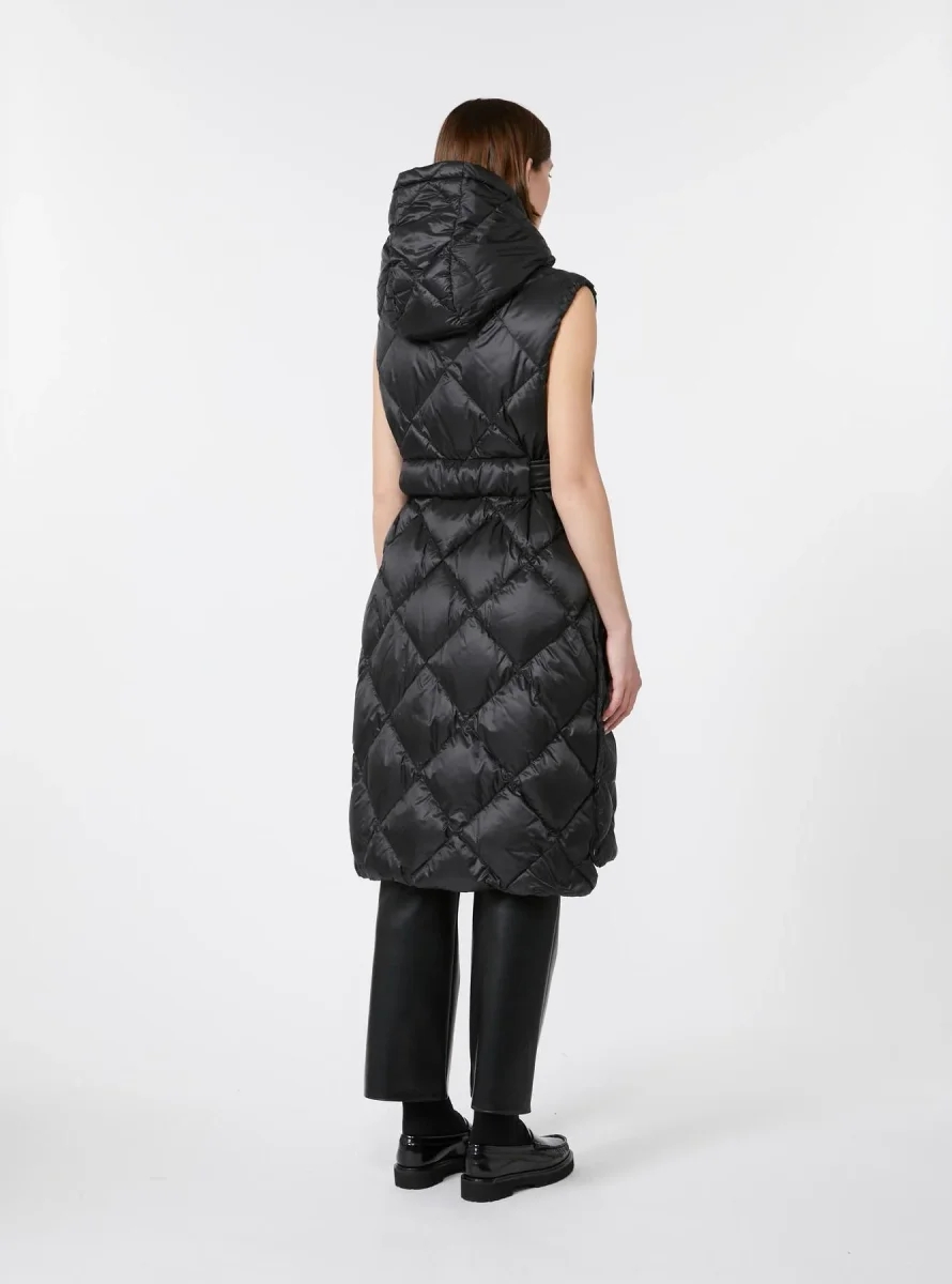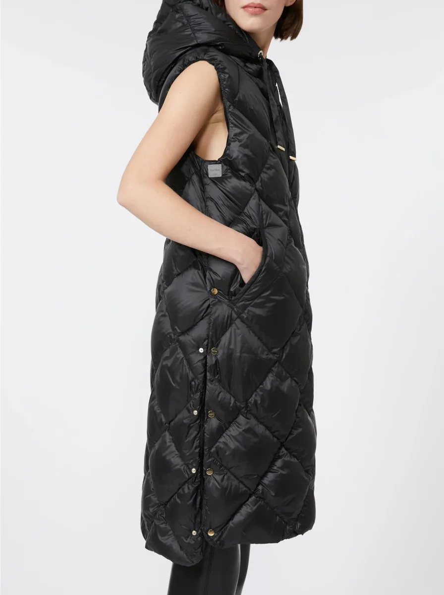 Gilet in tela antigoccia, cappuccio con coulisse, chiusura con zip a doppio cursore, tasche a filetto, profondi spacchi laterali con bottoni, colore nero