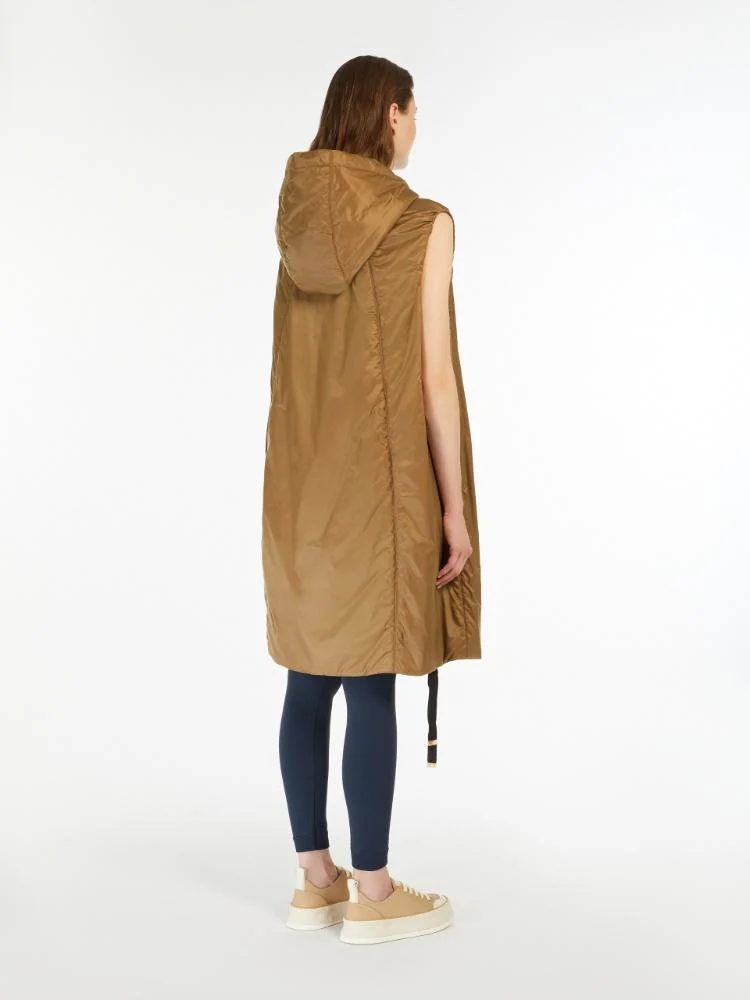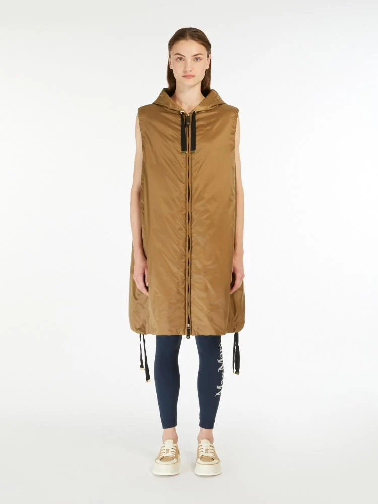Gilet Max Mara The Cube, modello in tela antigoccia, linea ampia, chiusura frontale con zip e doppio cursore in pelle, tasche inserite nei fianchi, colore beige