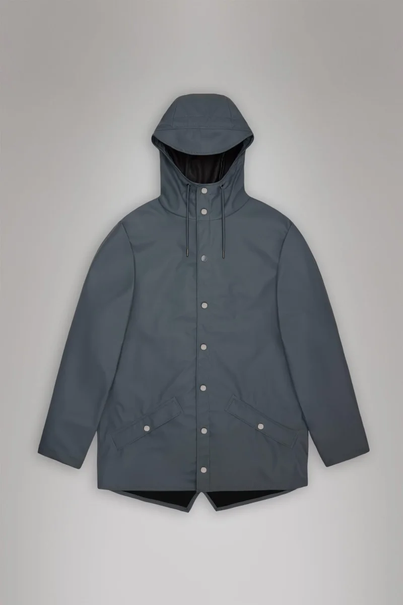 Giacca antipioggia unisex, modello con abbottonatura con automatici, cappuccio con visiera incorporata, tasche laterali con automatici, maniche regolabili con bottoni, colore blu