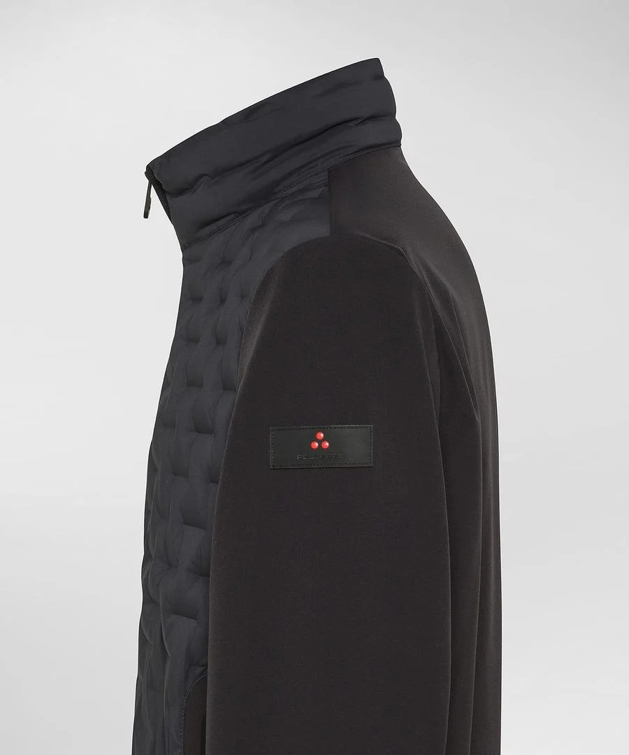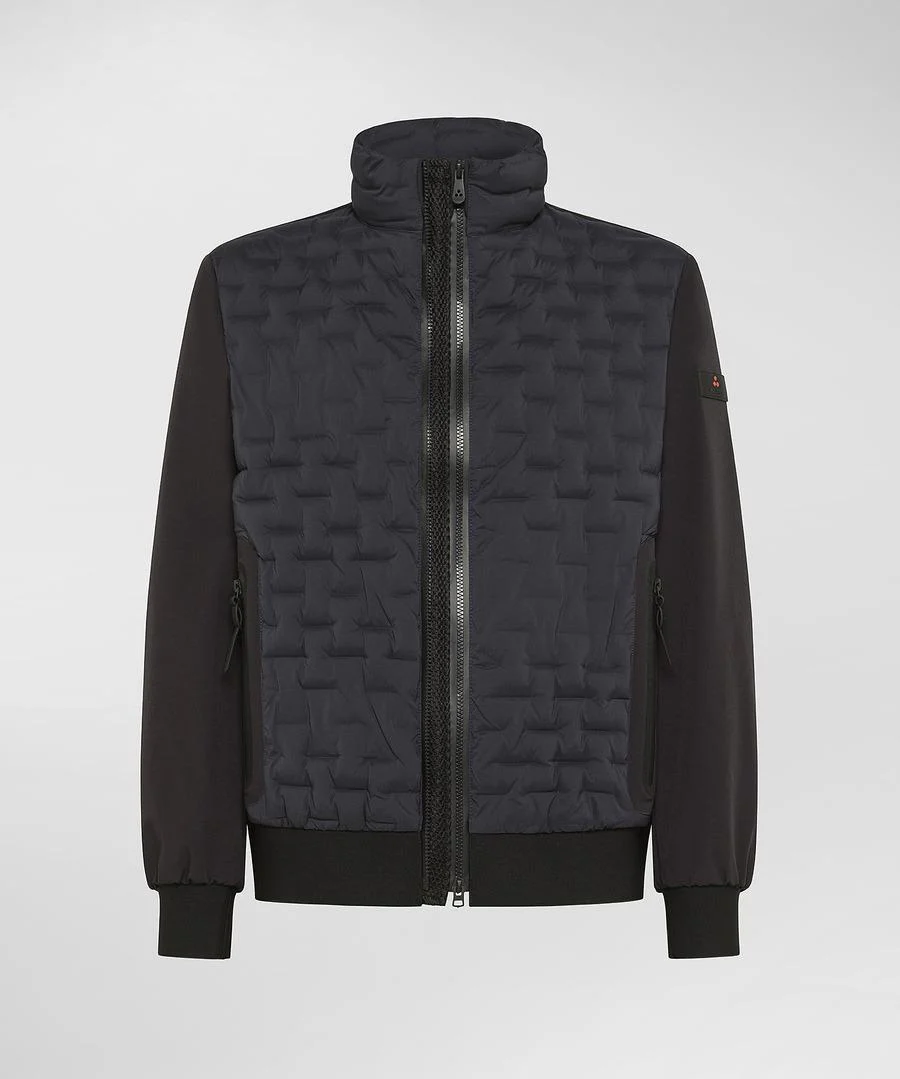 Bomber in doppio materiale: il tessuto primario è uno jacquard di poliestere stretch che, grazie a una speciale lavorazione di tintura, rivela contrasti di colore tra dritto e rovescio, per un effetto visivo unico e ricercato. Il tessuto secondario è un soft shell di nylon stretch accoppiato con un jersey di poliestere, soffice e caldo grazie alla finezza dei filati utilizzati. Parte dell’conica linea Transeasonal, una rappresentazione del concetto urban in cui comfort, praticità e stile si uniscono a uno studio approfondito dei materiali e dei pesi dando vita a capi versatili e adatti a ogni stagione. Il design è arricchito da una distintiva trapunta geometrica, maniche lisce e dettagli neri in contrasto e linee essenziali. La chiusura centrale con doppia zip che assicura comfort e praticità , le tasche laterali a filetto e il fondo e i polsini in tessuto nero
