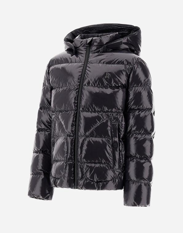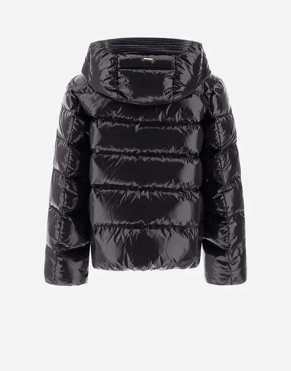Giubbino Herno bambino, vestibilità regular, collo alto, cappuccio rimovibile, chiusura con zip, tasche con bottone automatico, imbottitura in piuma d’oca, logo in metalo sul petto, colore nero