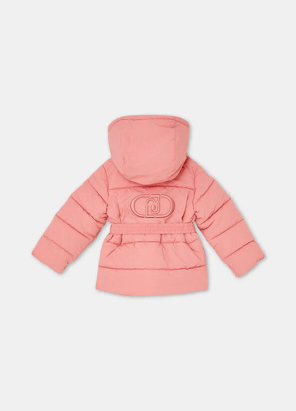 Cappottino imbottito in nylon trapuntato, imbottitura in ovatta, collo alto con cappuccio, tasche con patta, cintura elastica, tirazip logata, chiusura con zip, colore rosa
