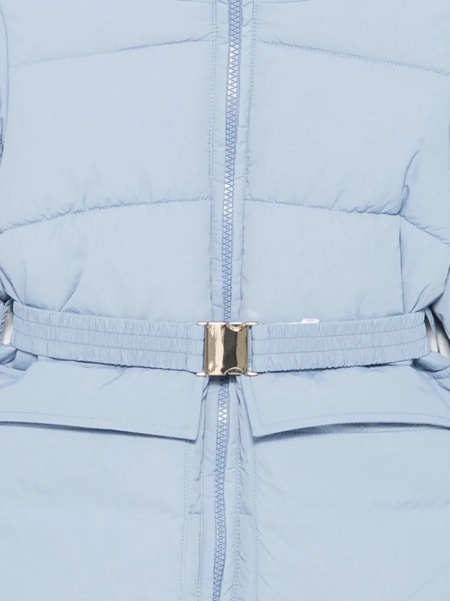 Cappottino imbottito in nylon trapuntato, imbottitura in ovatta, collo alto con cappuccio, tasche con patta, cintura elastica, tirazip logata, chiusura con zip, colore azzurro