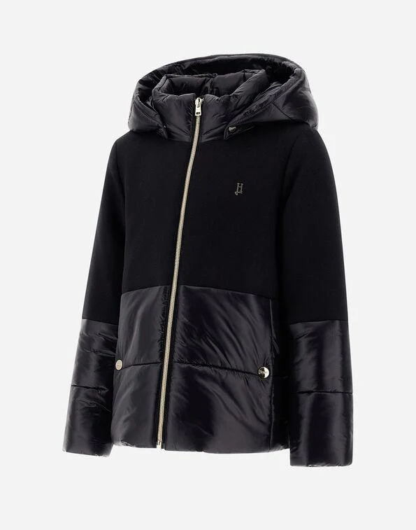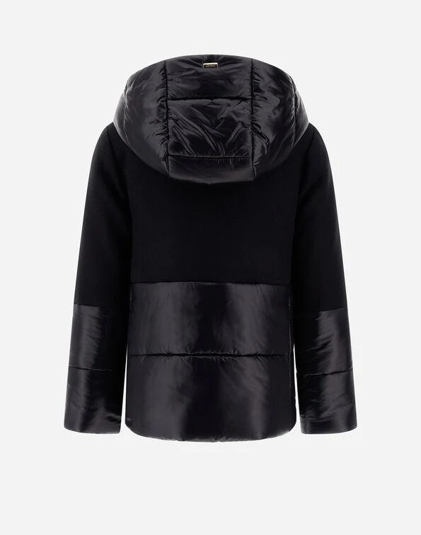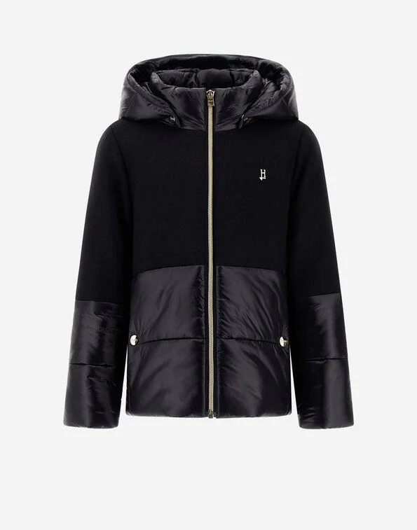 Giubbino in Ecowool Herno Kids, vestibilità regolare, imbottitura in ovatta, collo alto, cappuccio rimovibile, chiusura con zip, tasche con bottone automatico, logo in metallo sul petto, colore nero