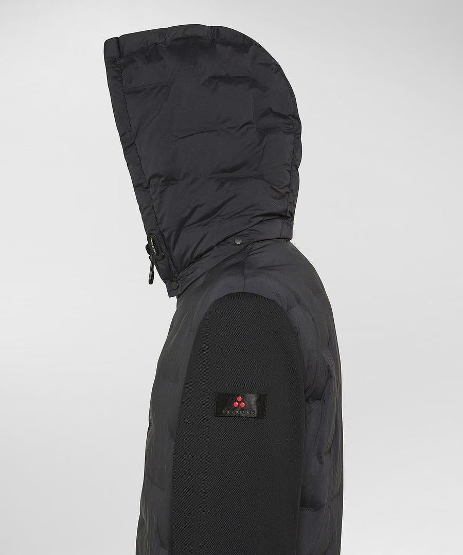 Giacca in doppio materiale: tessuto principale in jacquard poliestere stretch che, grazie a una speciale tintura, presenta un aspetto unico e una differente colorazione tra il dritto e il rovescio e l’esterno. Il tessuto secondario è un drill tecnico in nylon elasticizzato con un interno garzato, che offre un comfort estremo e un aspetto caldo e ricco. L’unicità del capo è completata da dettagli funzionali: zip centrale a doppio cursore, collo alto, cappuccio staccabile regolabile, polsini antivento e due tasche laterali. L’imbottitura in Thermoplume certificata GRS dona al capo la naturale morbidezza, leggerezza e comprimibilità della piuma naturale. Idrorepellente