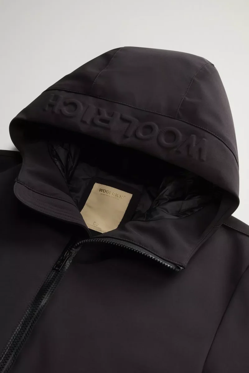 Giubbino Pacific in tessuto TechSoftshell, tessuto impermeabile e antivento, trapuntatura chevron all’interno, cappuccio con logo in rilievo, collo alto, chiusura con zip bidirezionale, coulisse sul fondo, tasca interna con zip, colore nero