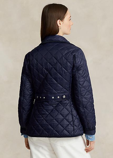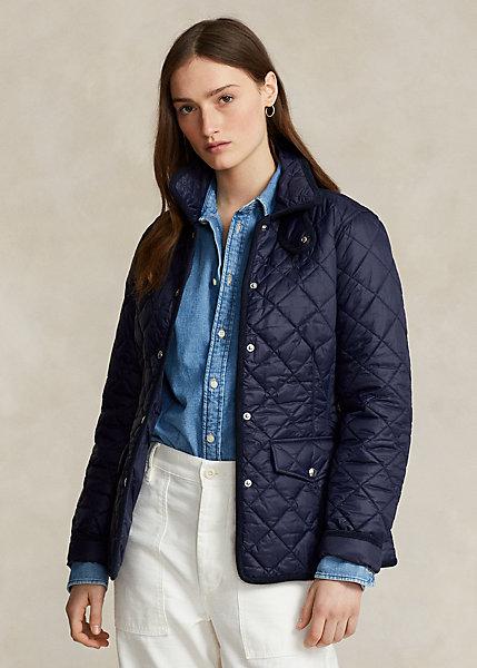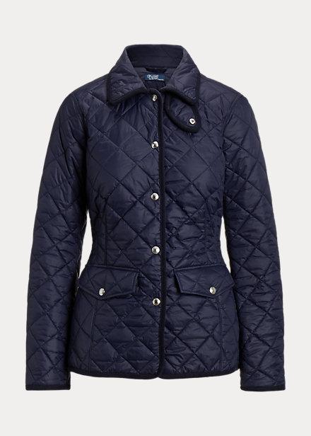 Giubbino trapuntato Polo Ralph Lauren, collo ampio, sottogola con automatici, chiusura con automatici, anello appendiabito interno, bordura in velluto a coste, maniche lunghe, due tasche a patta con automatico in vita sul davanti, esclusivo pony su un lato