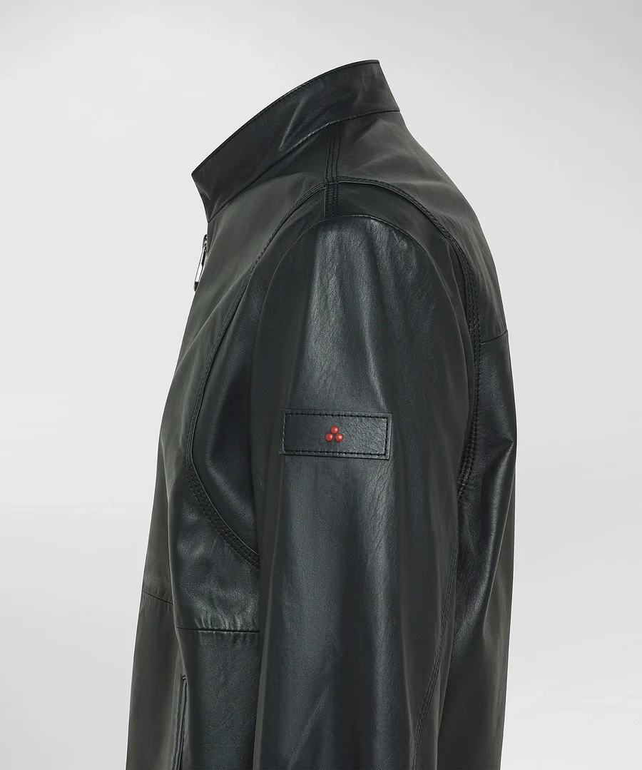 Bomber Tureia Peuterey, modello in morbida pelle tinta, collo, fondo e polsini in maglia, full zip metallica a doppio cursore, colore blu, vestibilità regular