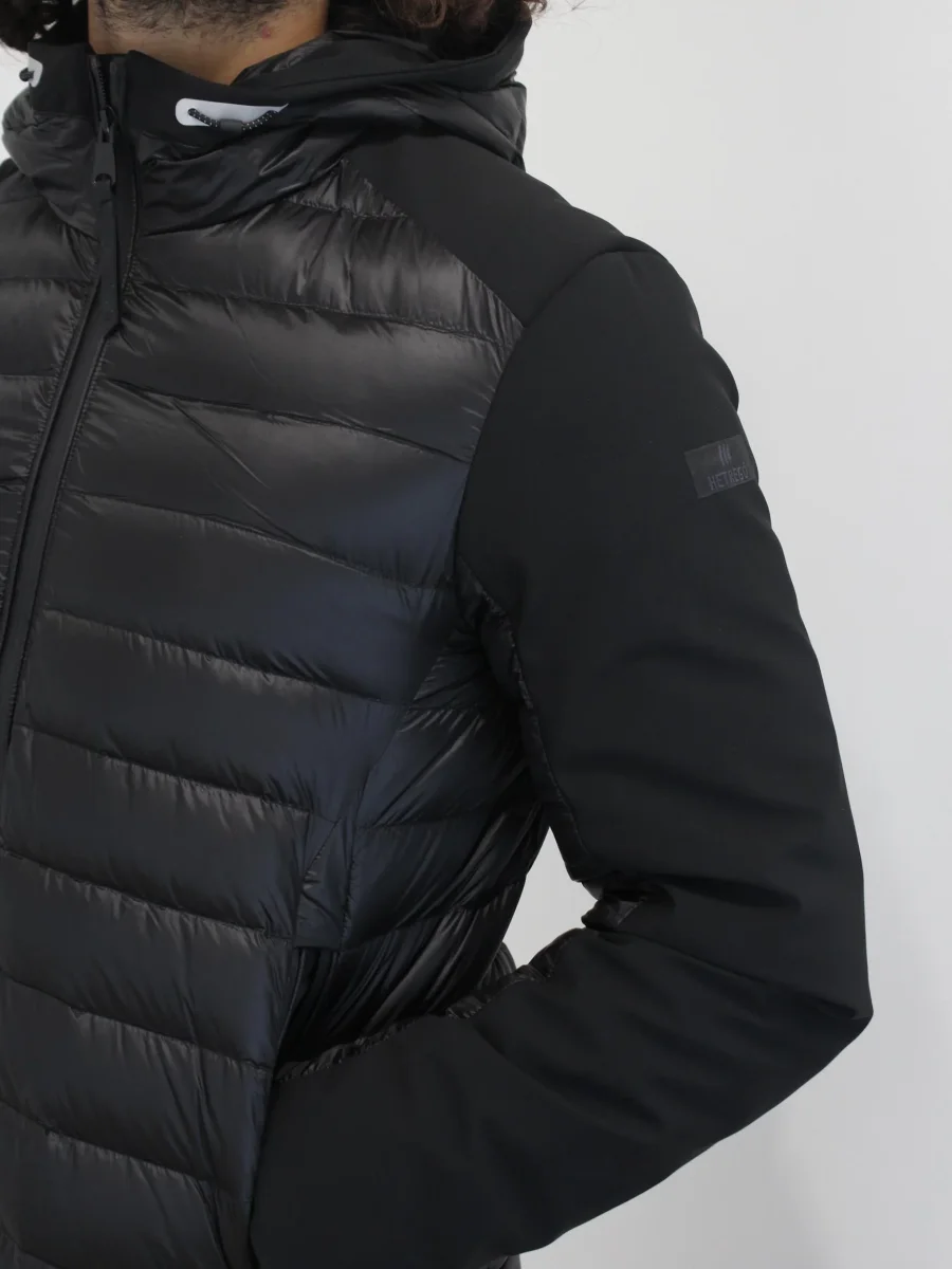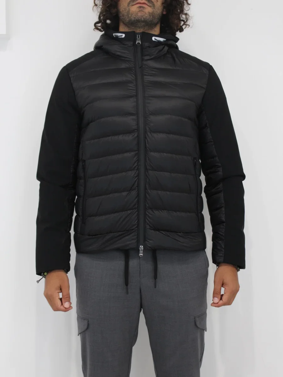 Giubbino Norris Hetrego, modello in bimateriale con inserti lisci e trapuntature boudin, chiusura con zip centrale a doppio cursore, tasche laterali con zip, cappuccio fisso, coulisse regolabile, logo sulla manica sinistra, tasca interna, imbottitura in piuma, colore nero