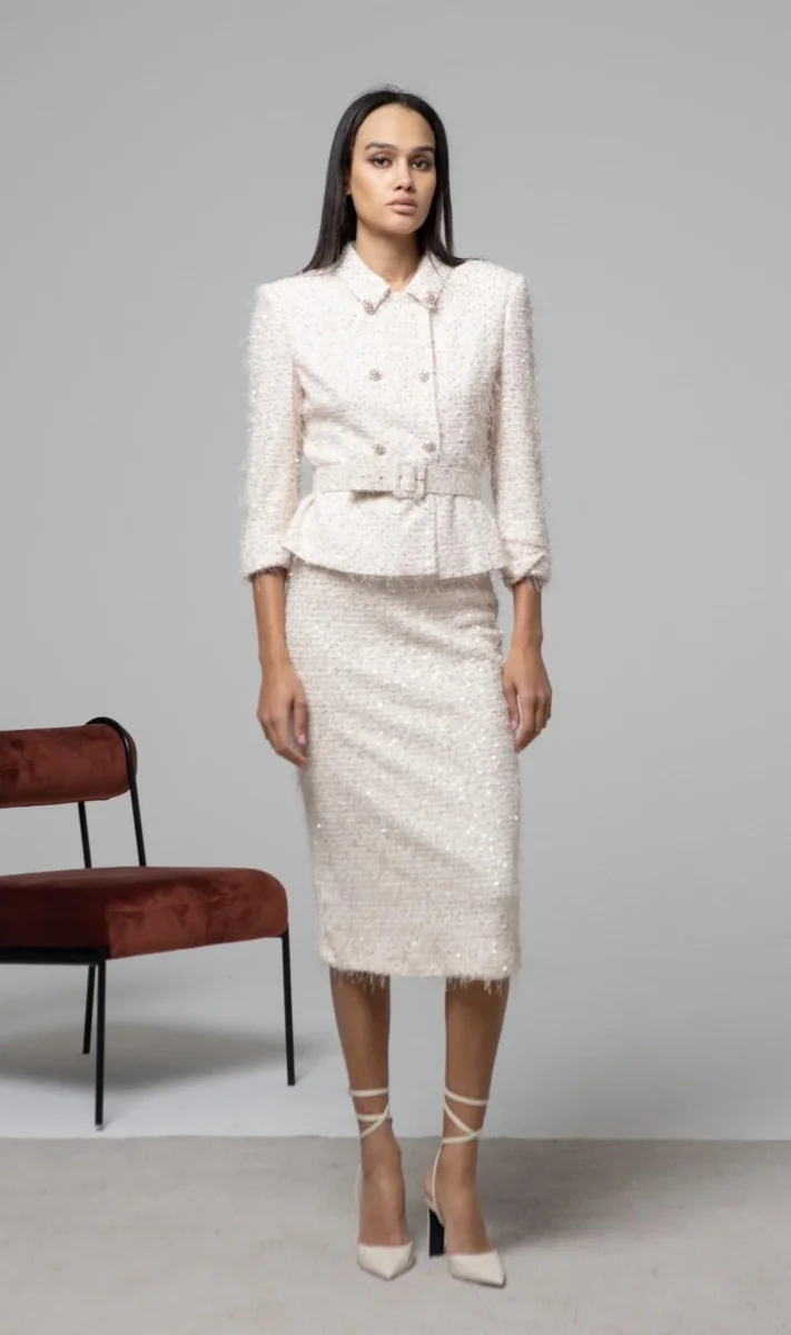 Gonna Hanita modello a tubino con applicazione pailettes all over, color crema