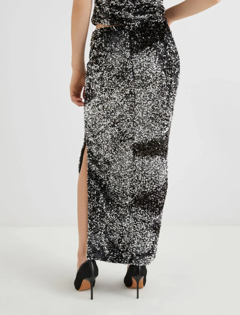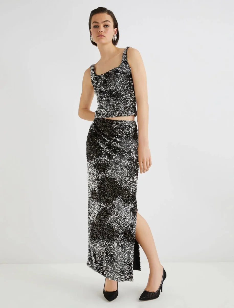 Gonna in velluto con pailettes Marella, fit dritto e linea pencil, apertura posteriore con zip invisibile, spacco a sinistra, colore grigio