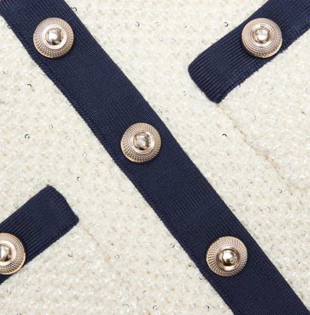 Gonna in maglia con tessuto elastico, chiusura con bototni sul davanti, cintura elastica, colore crema e blu