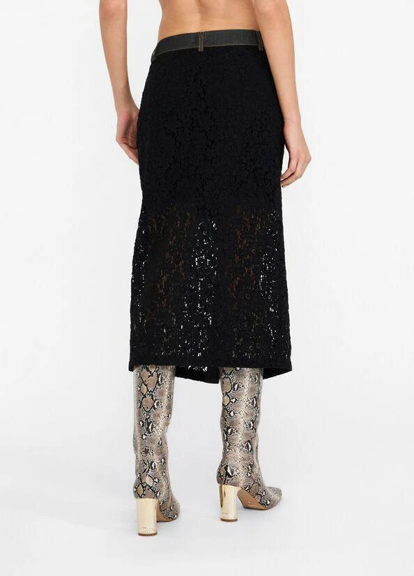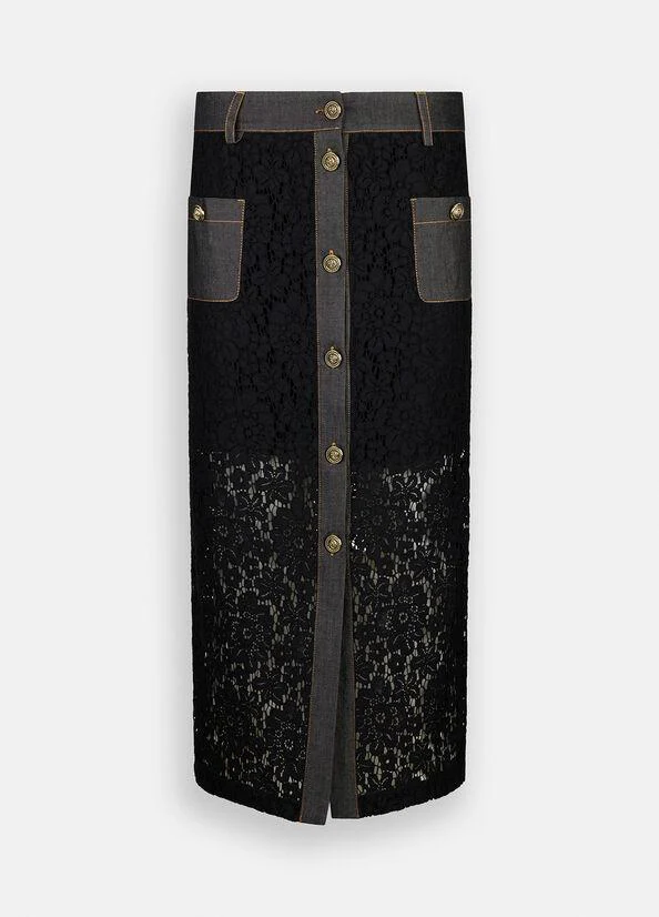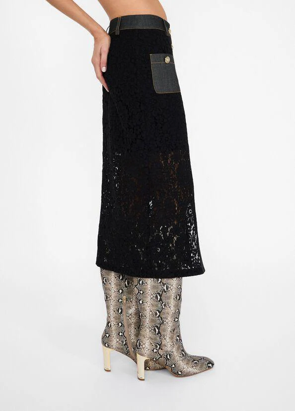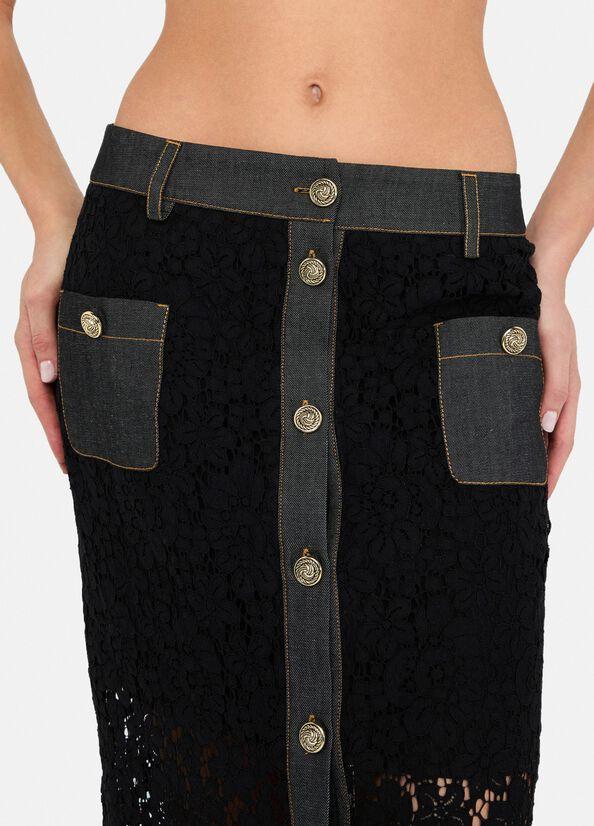 Gonna in pizzo longuette Liu Jo, modello con dettagli in denim, tasche con bottone, chiusura con bottoni e fodera interna, colore nero