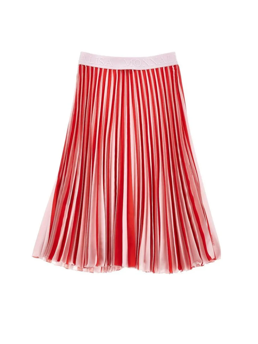 Gonna lunga plissè Monnalisa, modello con cinturino elastico logato, colore rosa e rosso