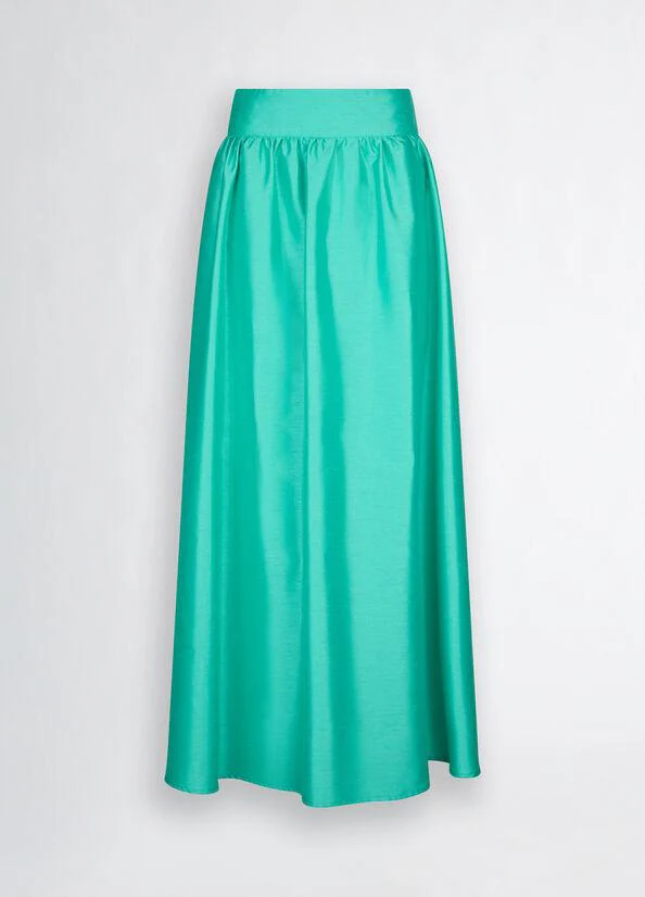 Gonna lunga in shantung, colore verde, design elegante, fascia in vita alta, chiusura con zip posteriore, colore verde