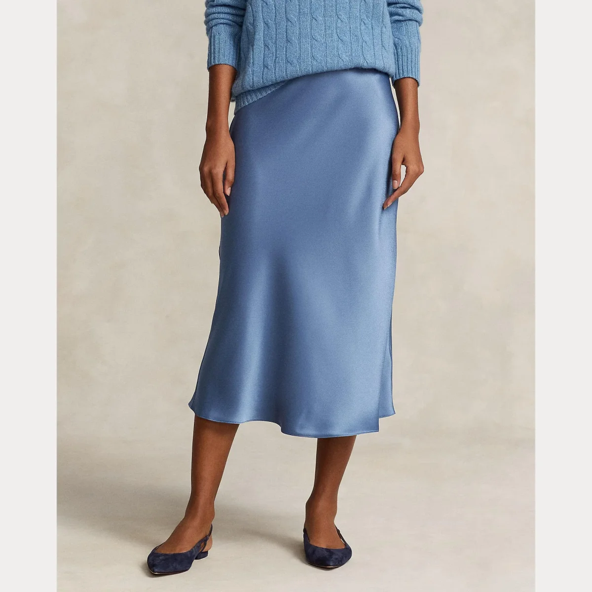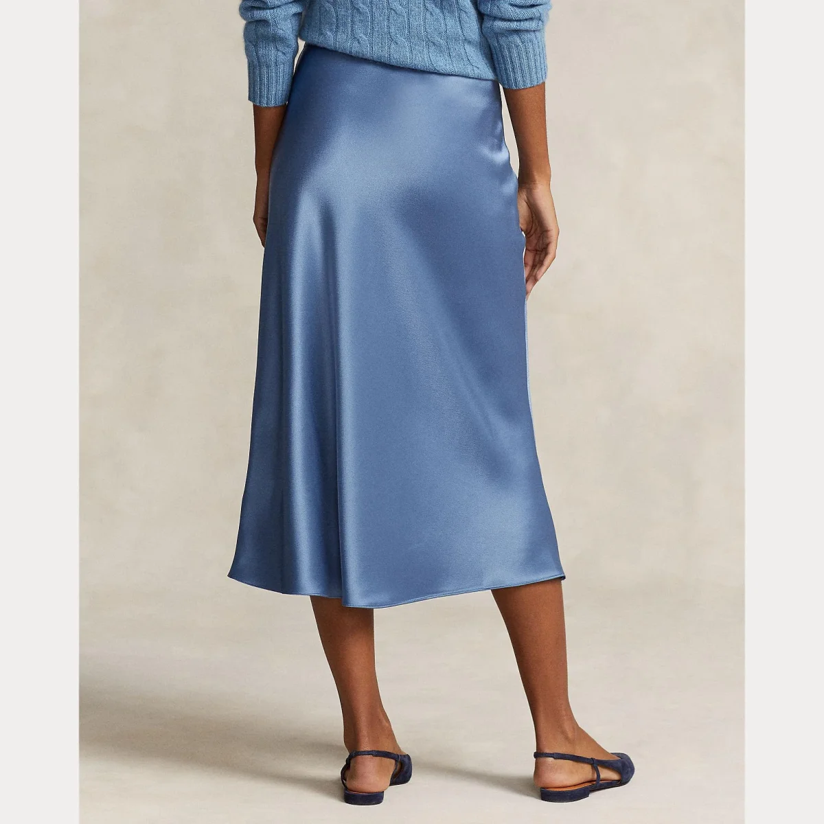 Gonna midi in raso Ralph Lauren, modello in raso giapponese double face, silhouette a sirena, colore azzurro