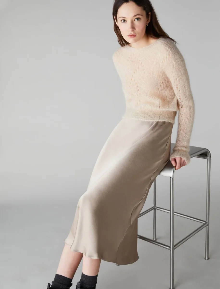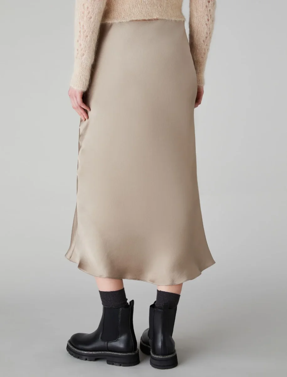 Gonna midi ecrù donna, modello in tessuto fluido leggero, effetto lucido, linea dritta, vita elastica, sfoderata