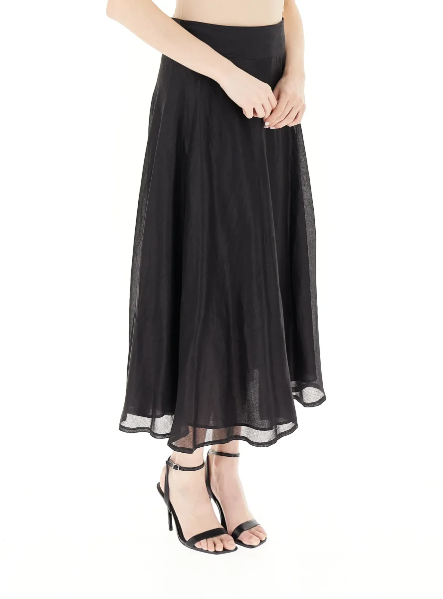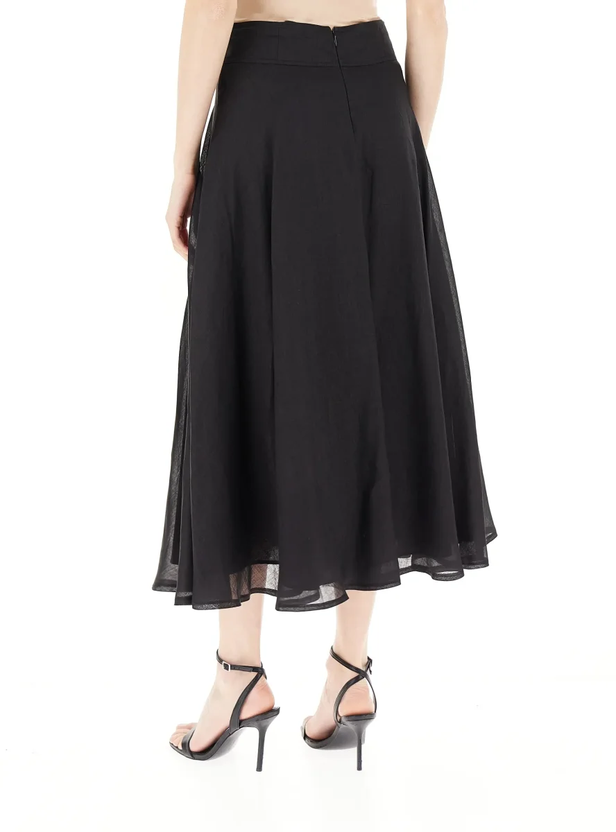 Gonna in tela di puro ramiè, fit svasato, apertura posteriore con zip, modello foderato, colore nero