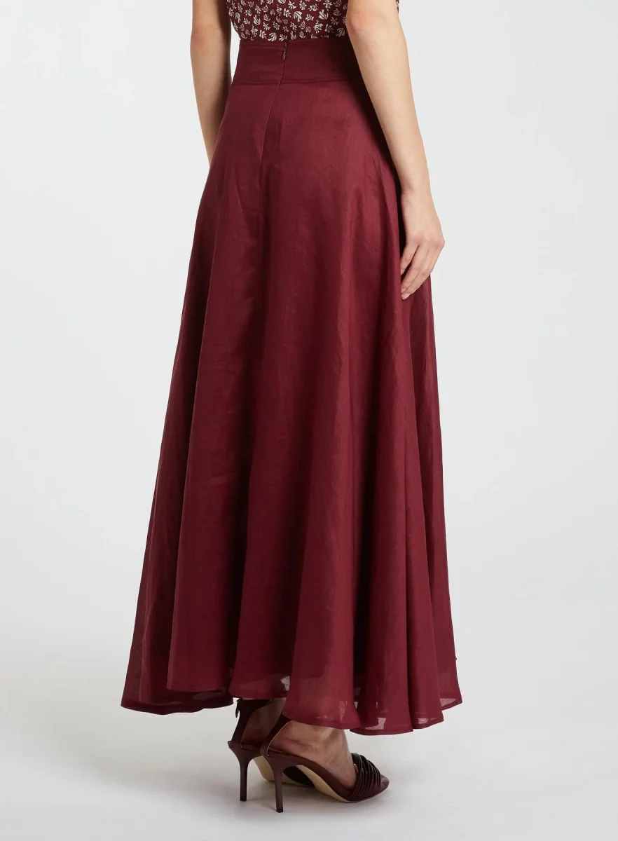 Gonna in tela di puro ramiè, fit svasato, apertura posteriore con zip, modello foderato, colore bordeaux