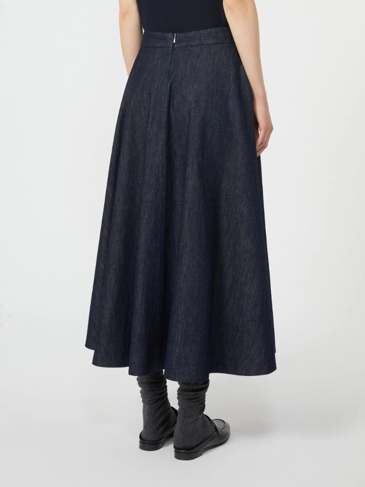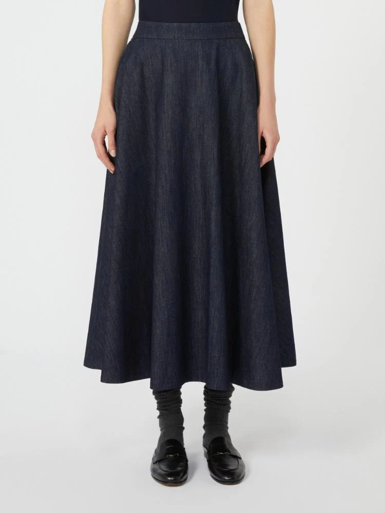 Gonna in denim di cotone Max Mara, vita regolare, chiusura con zip invisibile sul retro, tasche alla francese sui fianchi, colore blu
